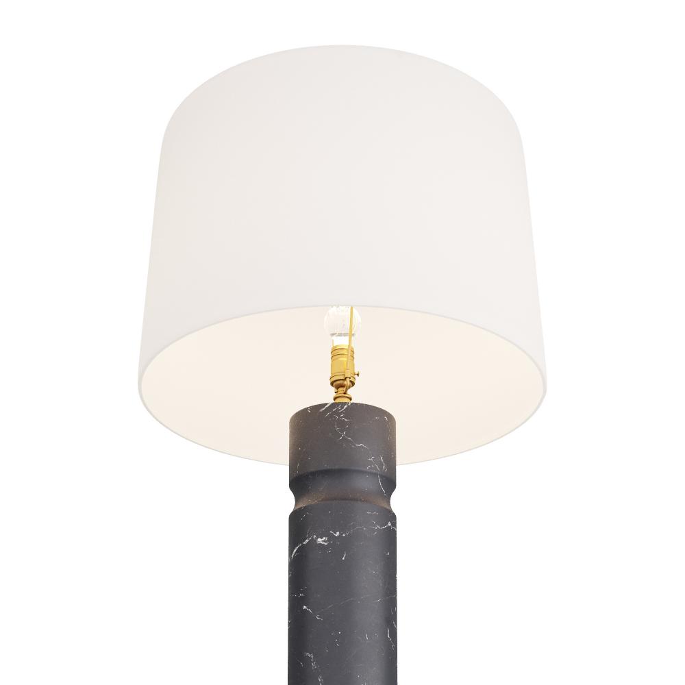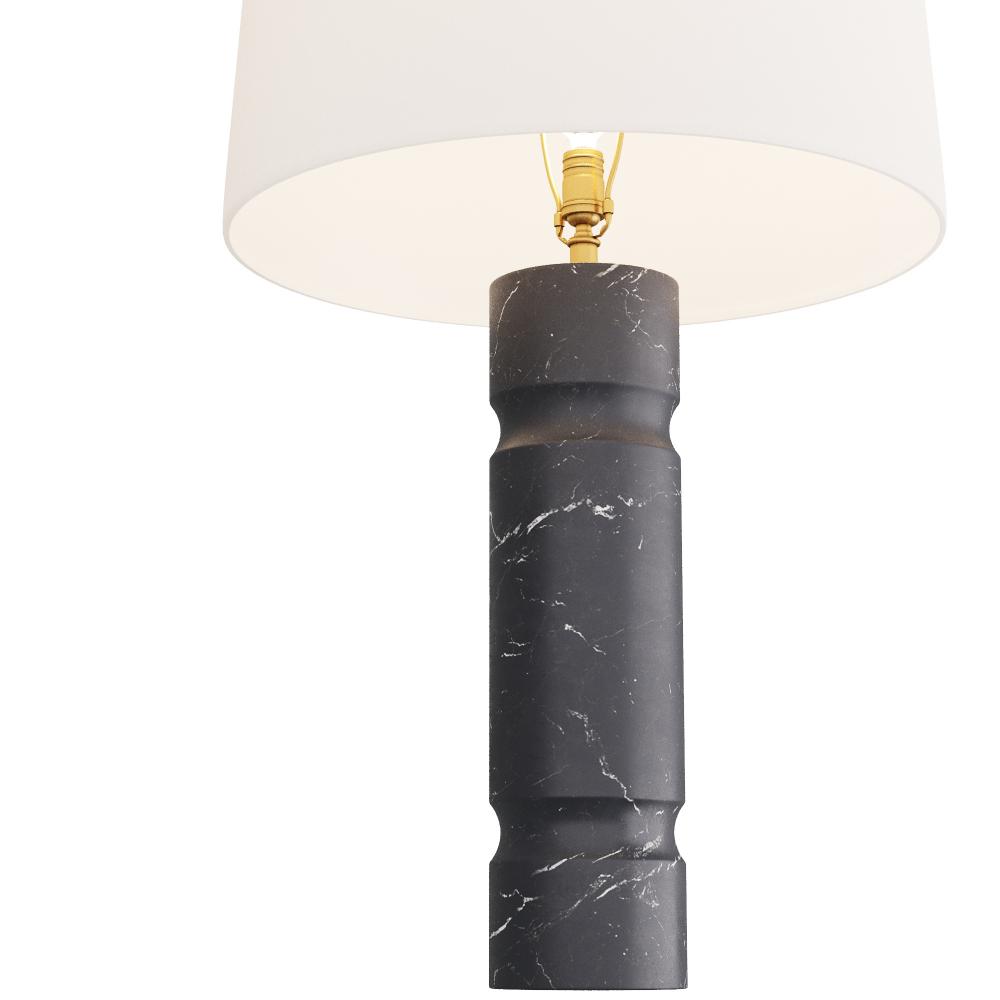 This essential lamp of black marble is ready for a supporting role in any décor. Topped with a drum microfiber shade lined in cotton and accented with antique brass finish hardware, it is an elegant accent for any desk or table. Taupe cloth-wrapped cord and three-way rotary switch.