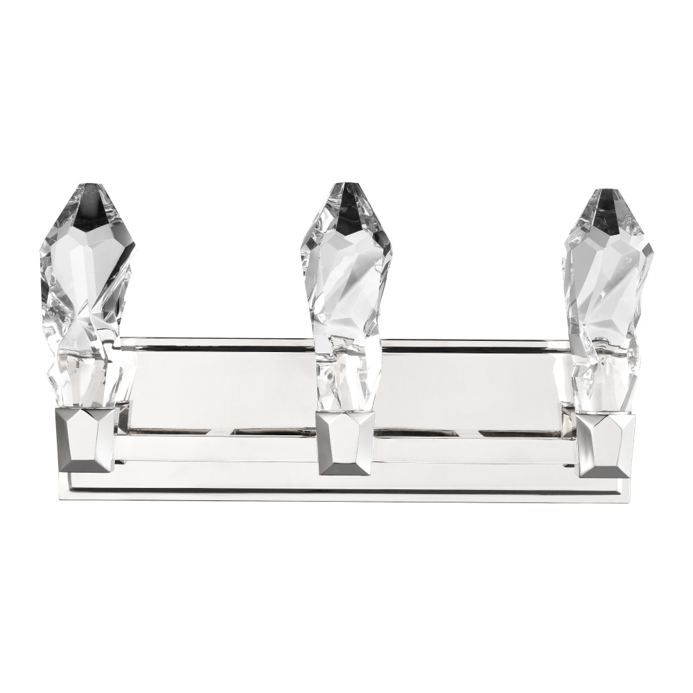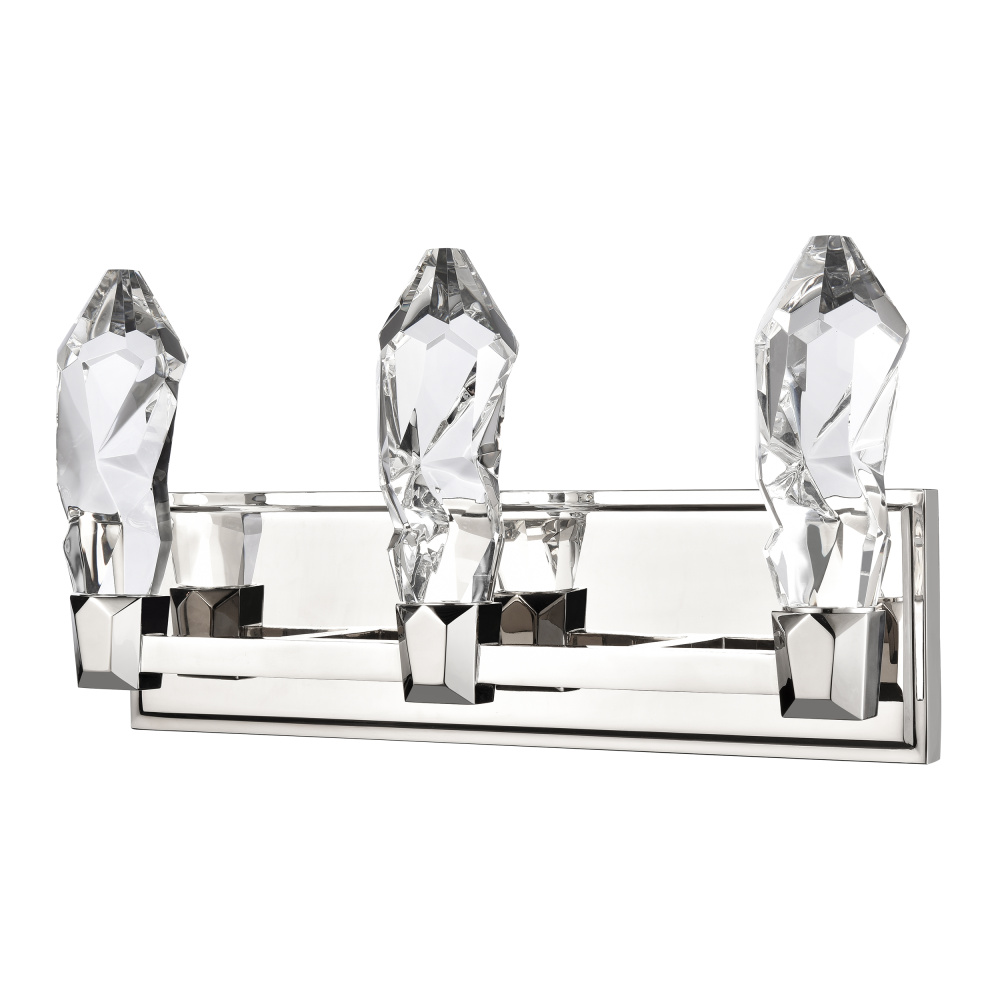 3-Light Inimitable Crystal Vanity Light, hand formed and polished crystal, with every turn of the crystal being unique. Refined metal with our luxurious polished nickel finish. Integrated Replaceable LED with 3CCT 3000K, 3500K and 4000K.