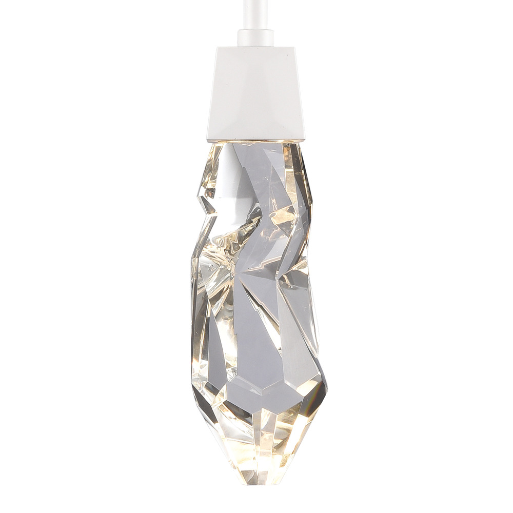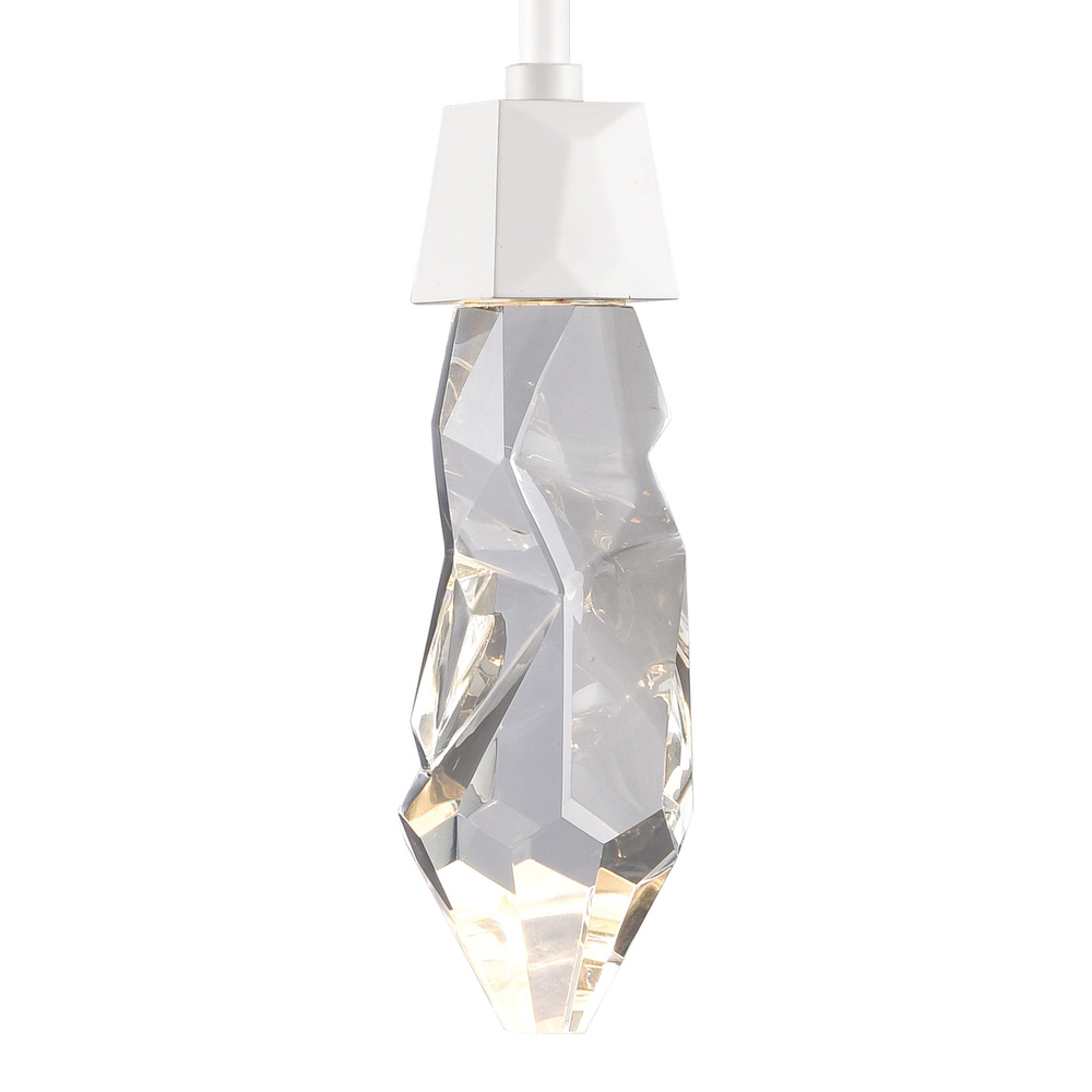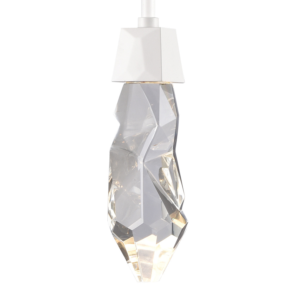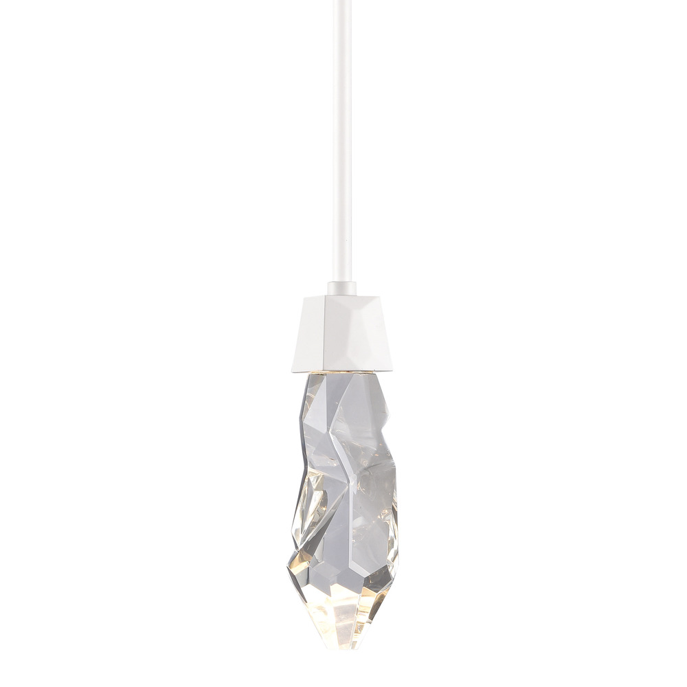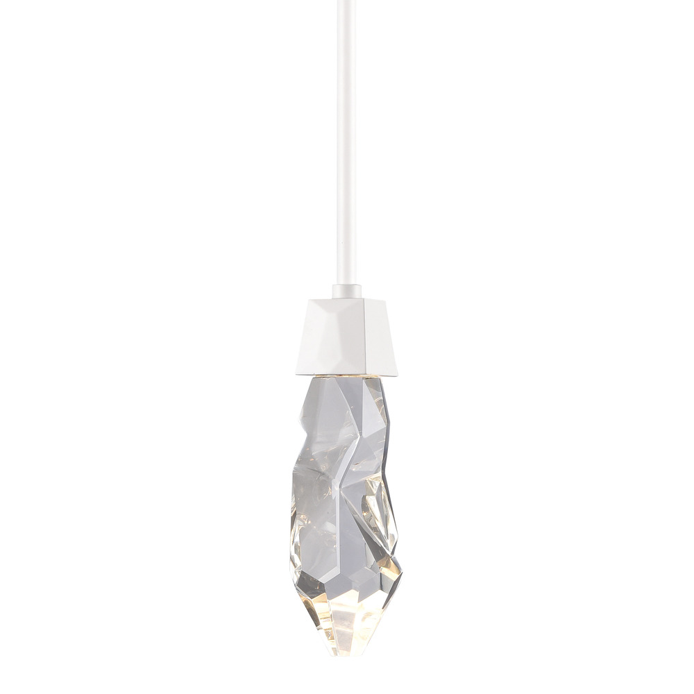 1-Light Inimitable Crystal Mini-Pendant, hand formed and polished crystal, with every turn of the crystal being unique. Refined iron metal with our chic matte white finish. Integrated Replaceable LED with 3CCT 3000K, 3500K and 4000K.
