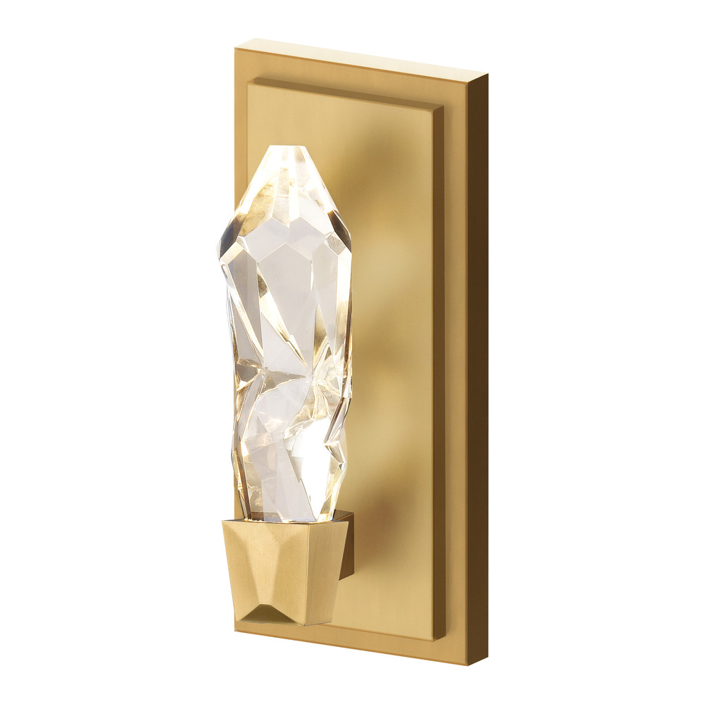 1-Light Inimitable Crystal Vertical Wall Sconce, hand formed and polished crystal, with every turn of the crystal being unique. Refined iron metal with our premium aged brass finish. Integrated Replaceable LED with 3CCT 3000K, 3500K and 4000K.