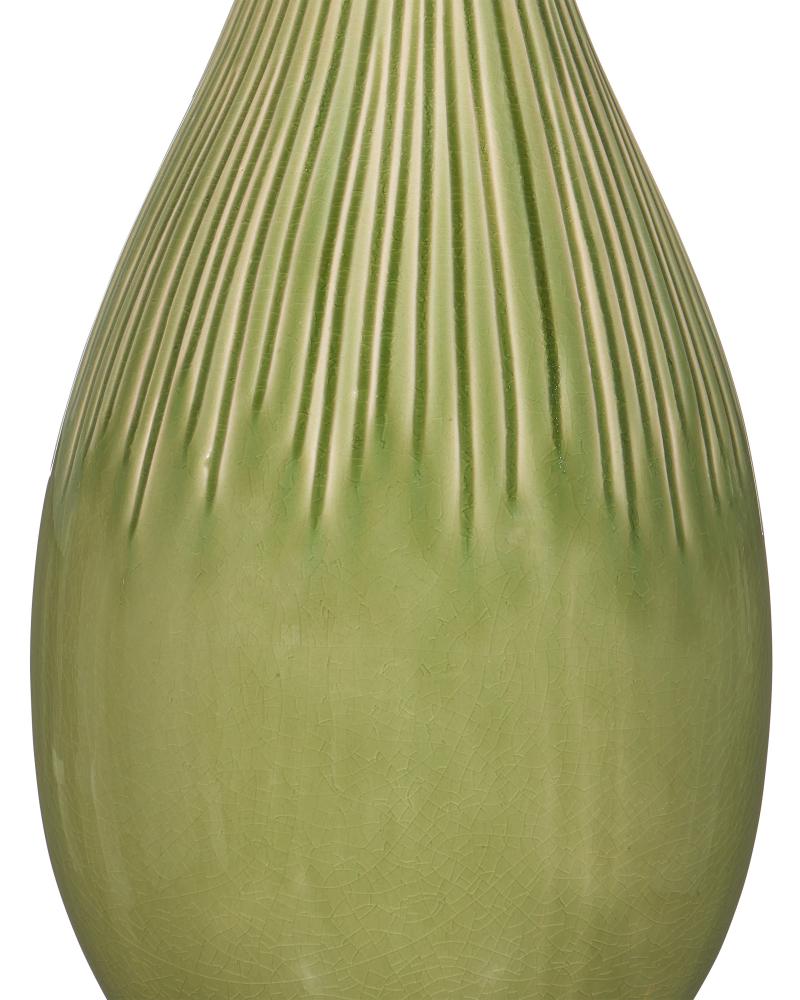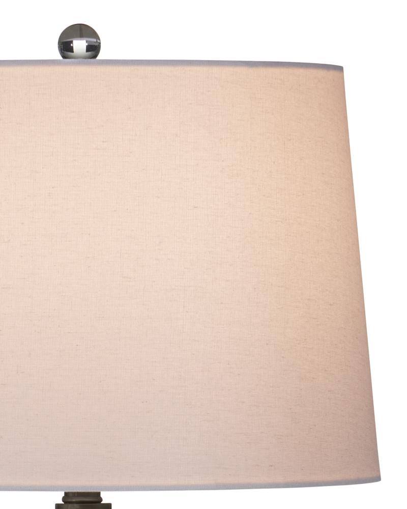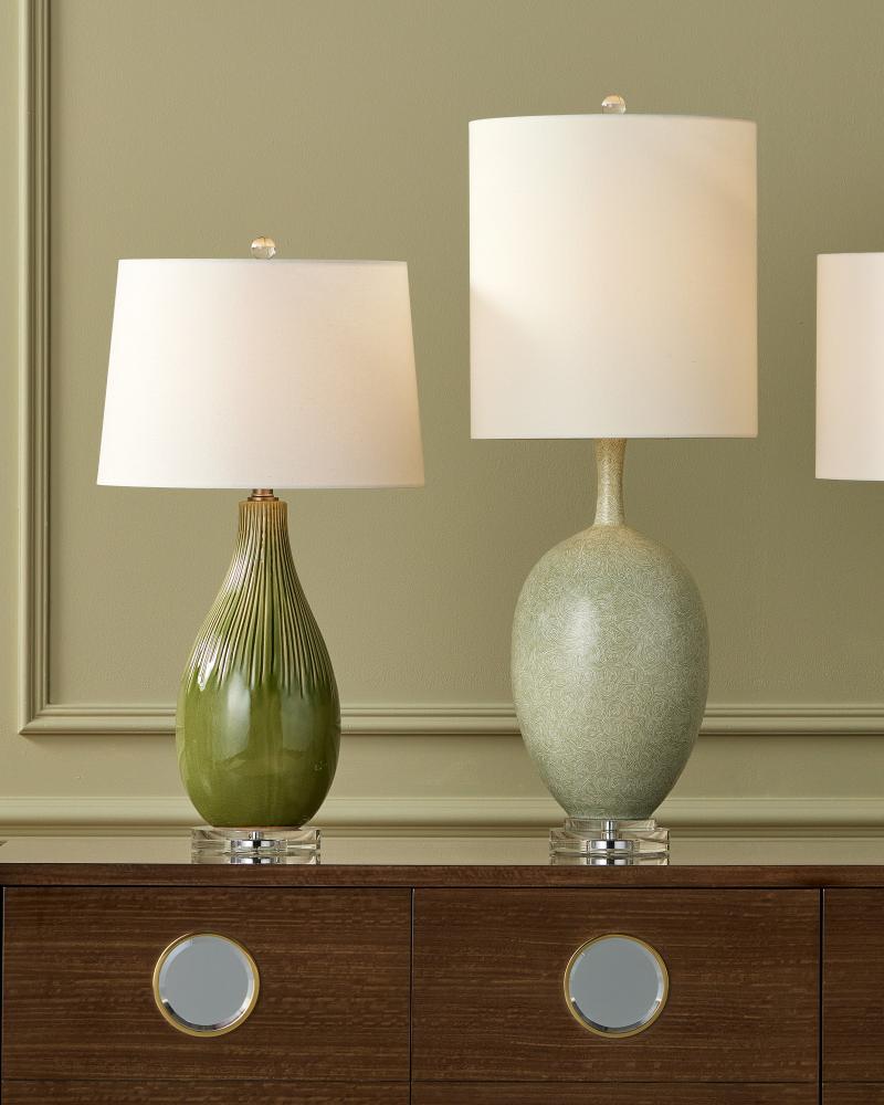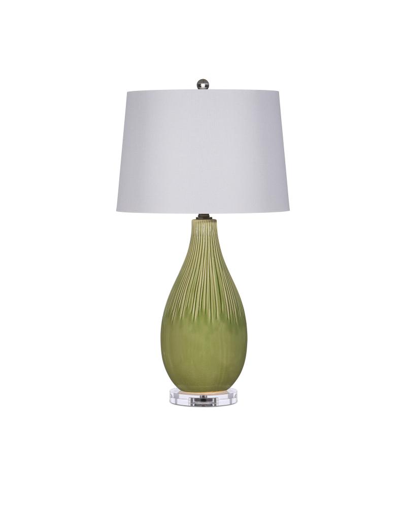 The Anjou Table Lamp is a glamorous creation made of ceramic with a rich green glazing that has been artfully applied to flow seamlessly down from the striations that are carved into the top section of the pear-shaped lamp. The optic crystal base and finial are luminous accents, and the satin brass finish on the hardware is warm in tone, as is the linen natural shade that tops the green lamp.