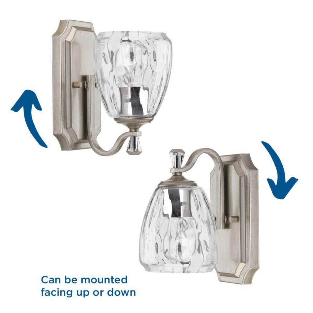 Ideal for a bathroom, hallway, or foyer;Perfect for luxe, new traditional, traditional, and transitional style settings;Sleek silver ridge finish with polished nickel accents;Elegant clear water glass shade;Mount the light fixture facing up or down;Use 1 m