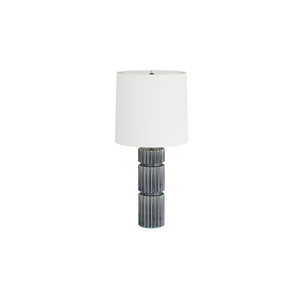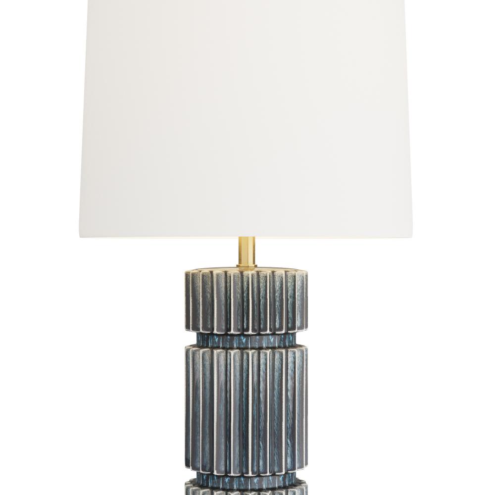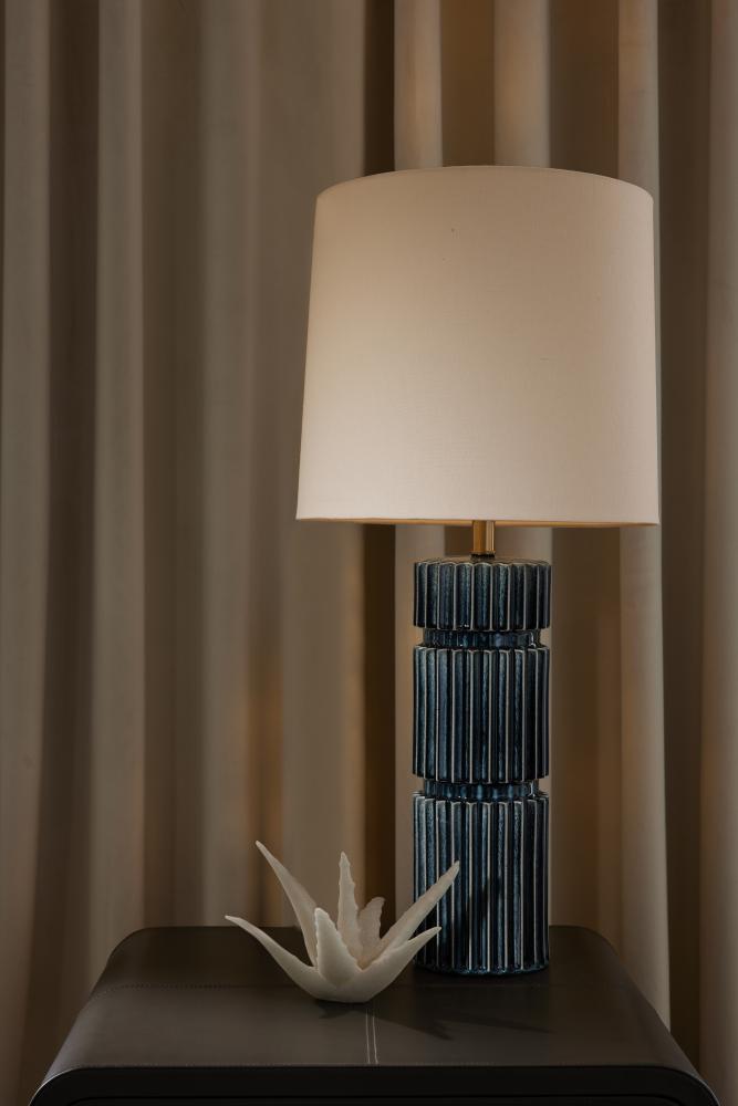 Sculpted in ceramic and finished in a reactive glaze of ocean, the Annika’s textural fluting is reminiscent of mechanical gears. Accented with an antique brass finished support and linen drum shade, it delivers the perfect marriage of industrial and modern design. Matching ocean ceramic finial, clear silver cord, and three-way rotary switch.