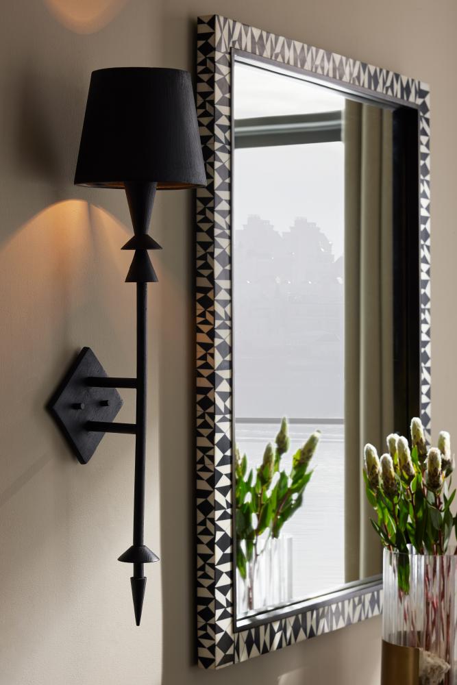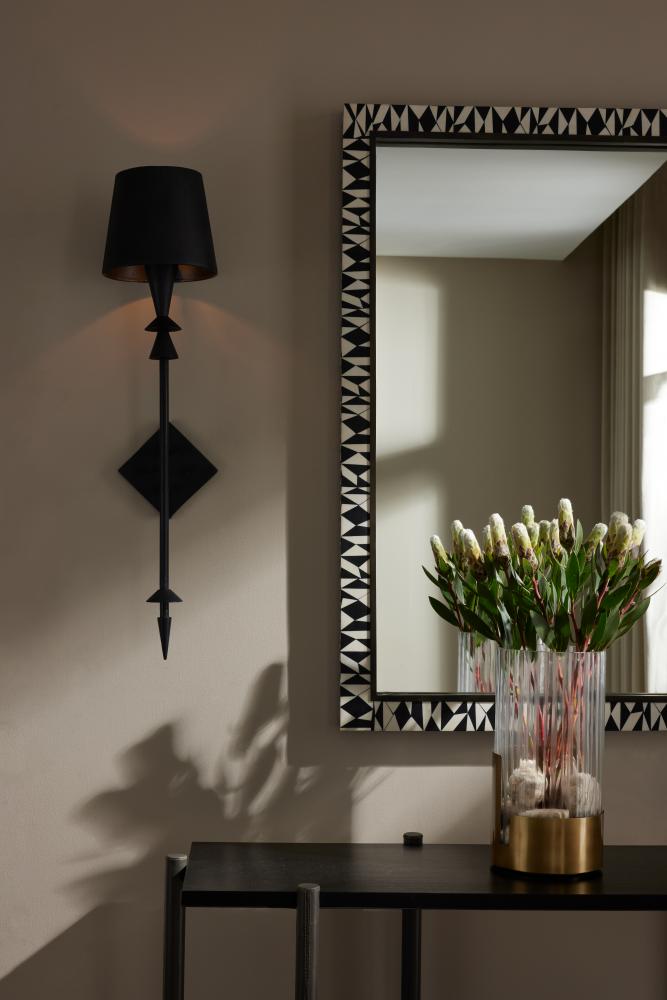 An Iron Age spear is the unlikely inspiration for our diamond-backed sconce of black gesso finish aluminum. Its unique finish and pointed support may also recall the rugged lines of a shanked fireplace poker. Topped with black gesso finished shade to keep the effect modern and moody. Damp-rated, although limited covered outdoor conditions may affect finish. Finish will vary.