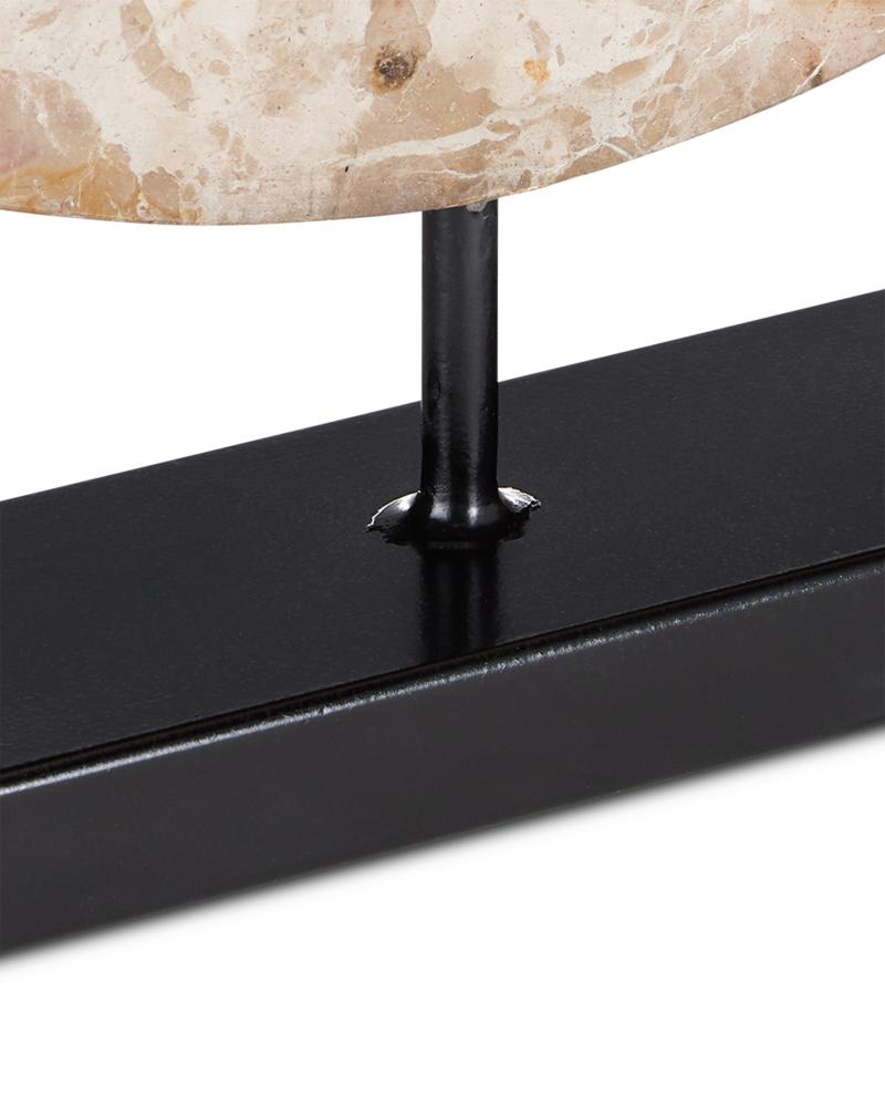 The Anu Marble Disc is a textural marvel. The pitting and mottling of the natural stone make the tan sculpture feel like a fossilized artifact, while the simplicity of the black metal base furthers the feel that this stone disc is museum-worthy. Because the personality of each slice of stone varies, each of these decorative accessories will be unique.