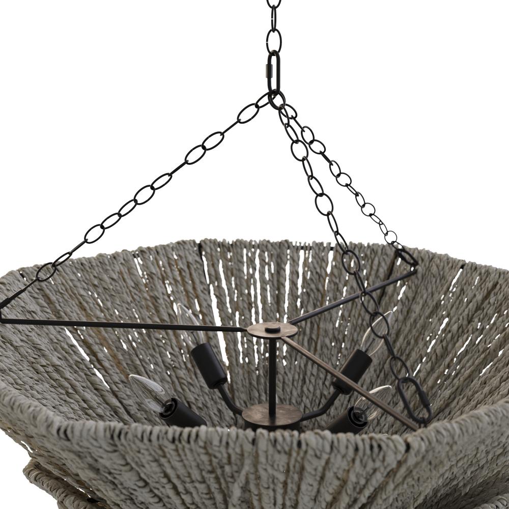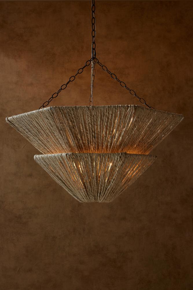 Two tiers of light gray stained sustainable abaca provide a soothing effect. Reminiscent of mountain peaks, its textural silhouette is designed to bounce light upward to flattering effect. Suspended from a trio of antique brass finished chains. Finish will vary.