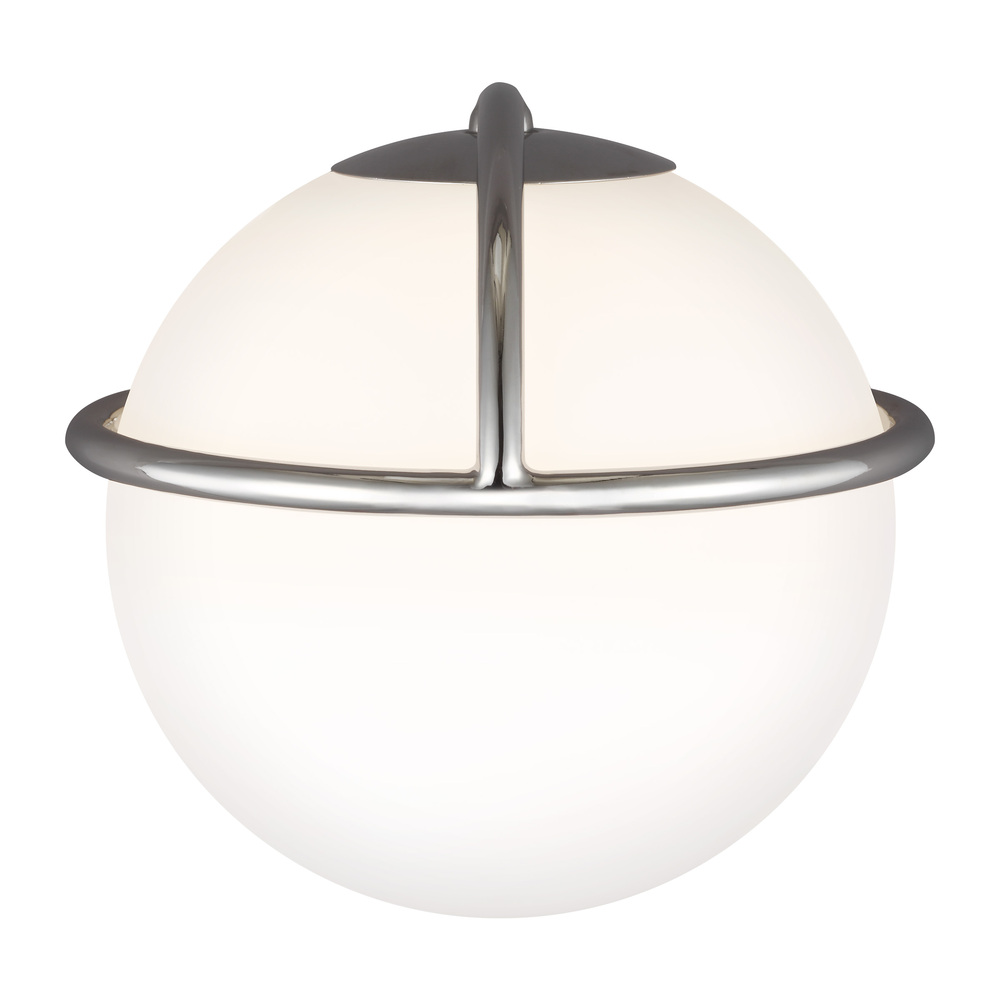 The modernist Apollo impresses with perfectly balanced White Opal Etched Glass globes that gently rest within a spherical Burnished Brass or Polished Nickel frame