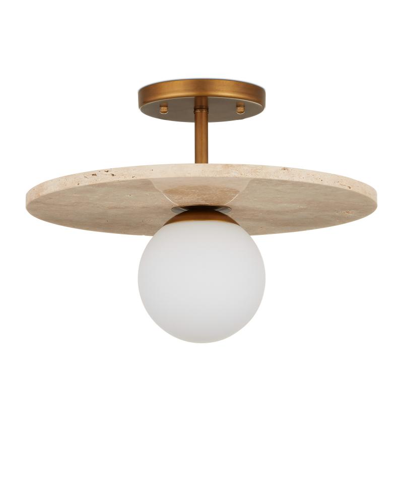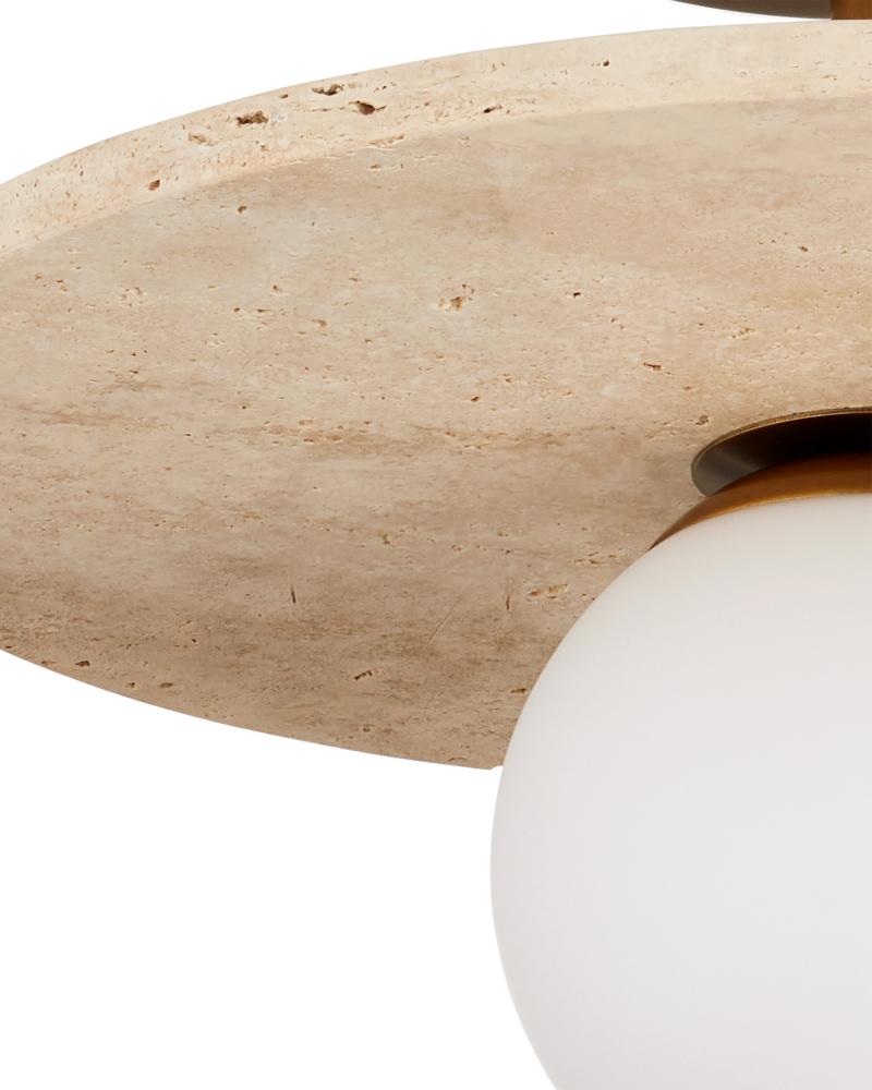 Inspired by a piece of jewelry, the Apricity Semi-Flush Mount features a frosted white cast-glass globe fitted to a travertine disc by metal hardware in an antique brass finish, reminiscent of a large pearl with its beautiful sheen. The simplicity of the profile leaves the glowing orb as the focal point of this design, while the way the illumination strikes the natural stone adds a clever aspect. The warmth of the metal draws out the subtle deeper tones in the travertine.