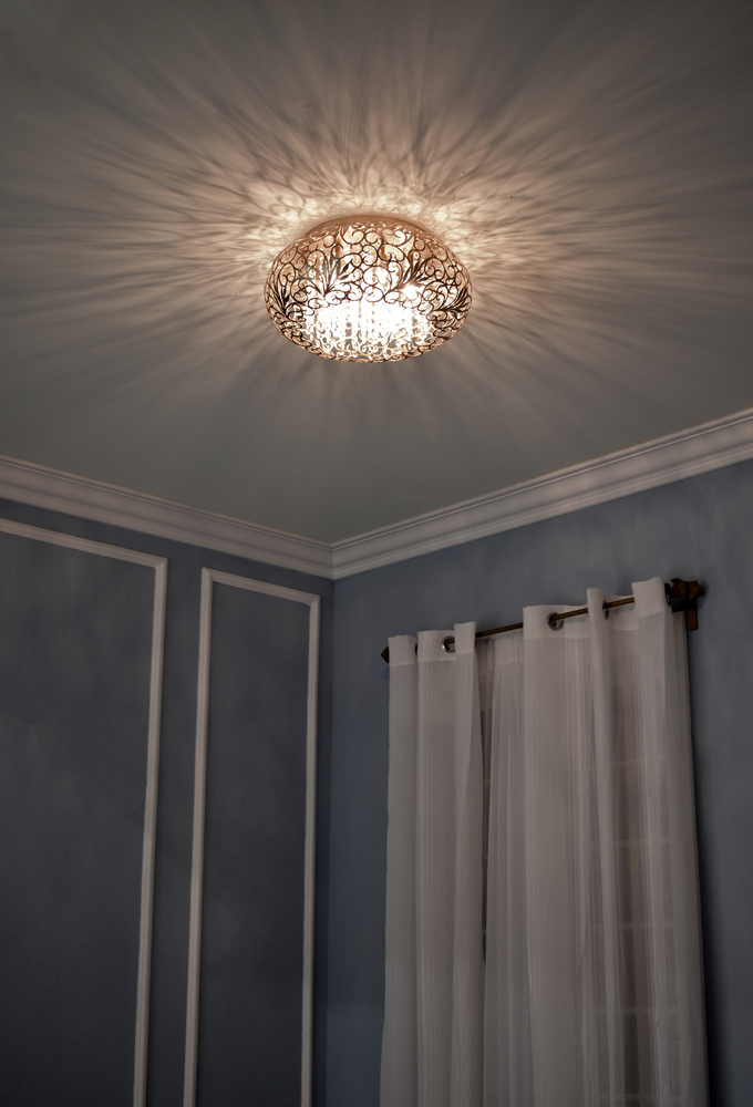 The Arabesque collection's intricate patterns are formed in metal and finished in Golden Silver. Strands of crystal beads add sparkle as they shimmer through the Xenon lamps.  Unique oval-shaped pendants add a touch of class to any room.