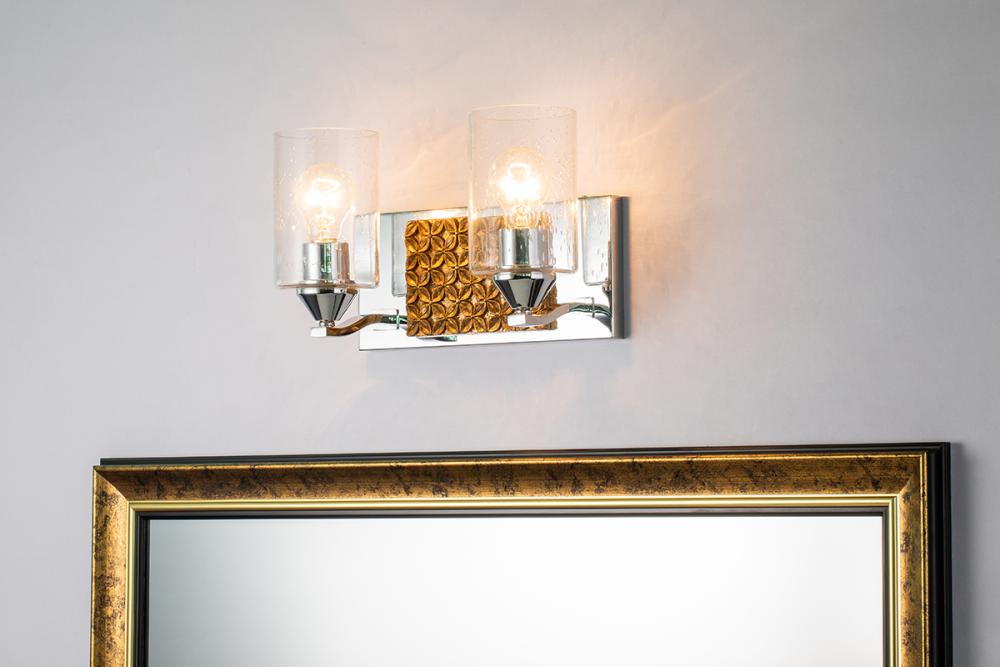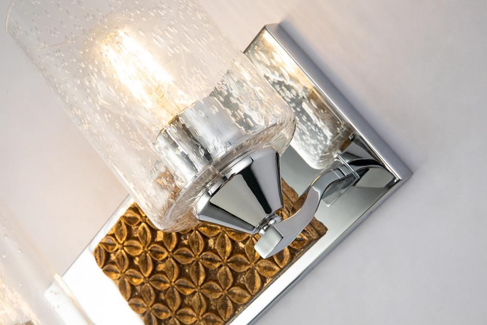 A 13" x 8" x 6.5" 2-light vanity in polished chrome and antique gold with a textured backplate and cylinder seeded glass. Adds Arcadia-inspired texture to bathrooms.