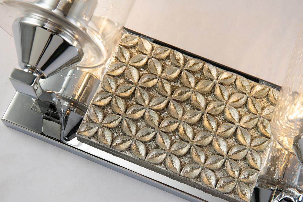 A 13" x 8" x 6.5" 2-light vanity in polished chrome and antique silver with a textured backplate and cylinder seeded glass. Brings Arcadia-inspired texture to bathrooms.