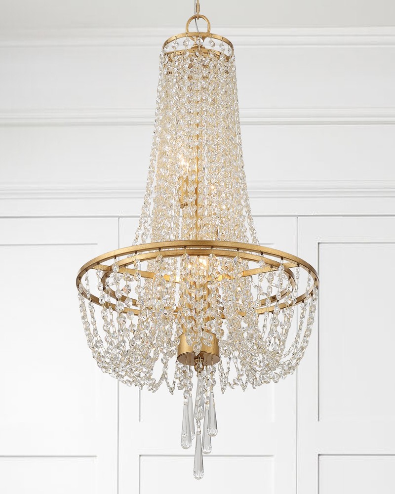 The Arcadia collection features a simple, transitional metal framework that is elegantly dressed with a beautiful crystal draping.