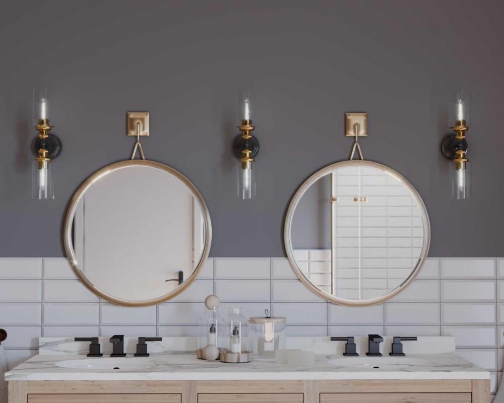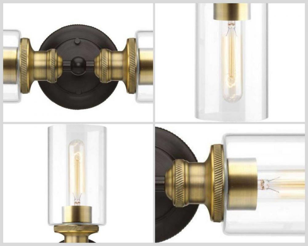 Ideal for a bathroom;Perfect for farmhouse, urban industrial, and vintage electric style settings;Handsome antique bronze finish with natural brass accents.;Crisp clear glass shades;Fixture can mount horizontal and vertical;Use 2 medium base bulbs that are