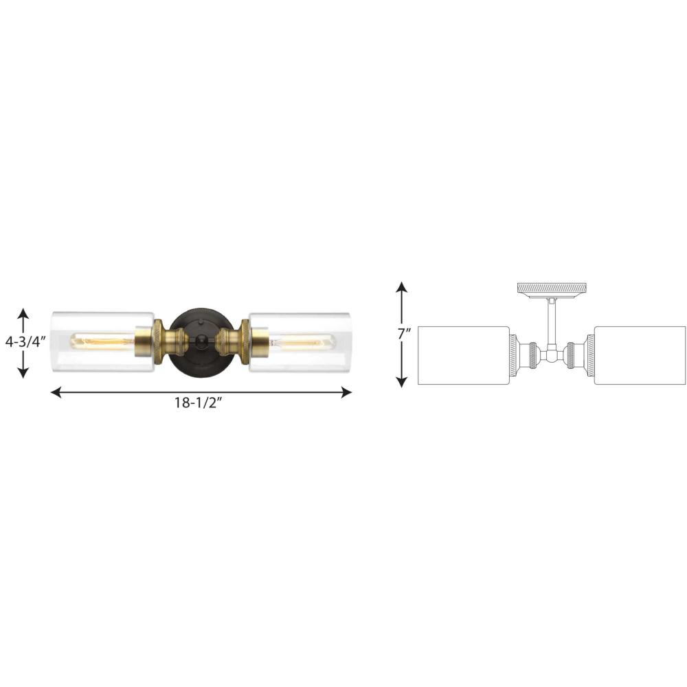 This two-light bath & vanity fixture offer a vintage electric feel. Clear glass shades featured on either side of the back plate. Two-toned finish in antique bronze with natural brass accents. Can be mounted horizontally or vertically.