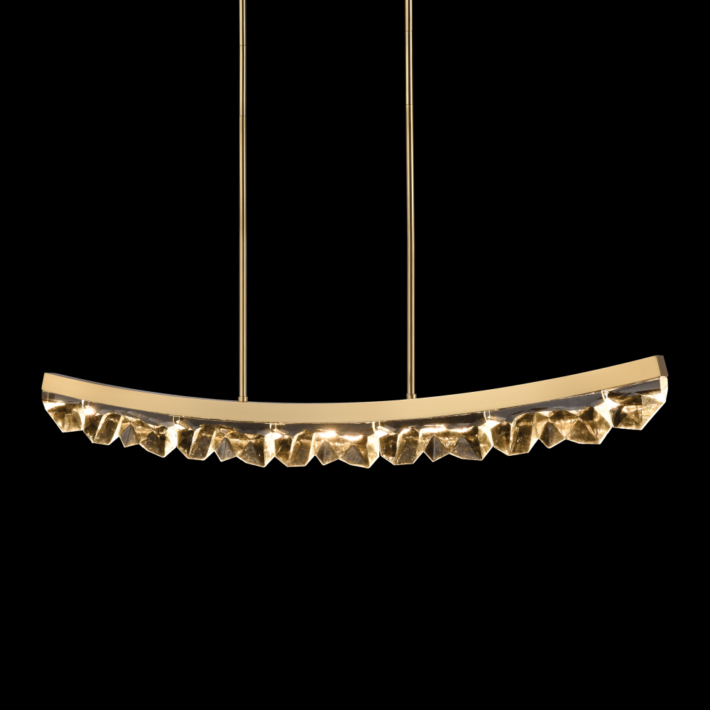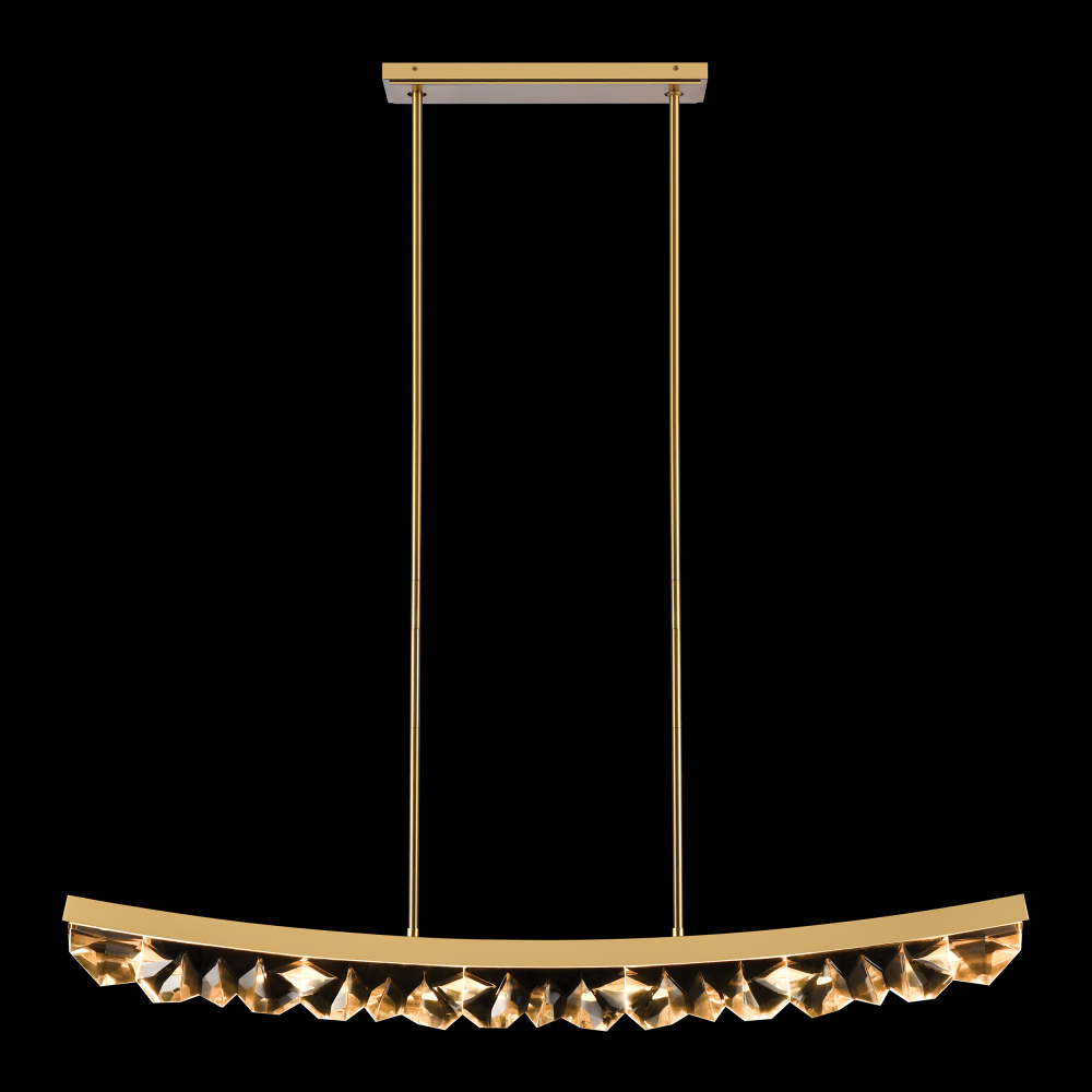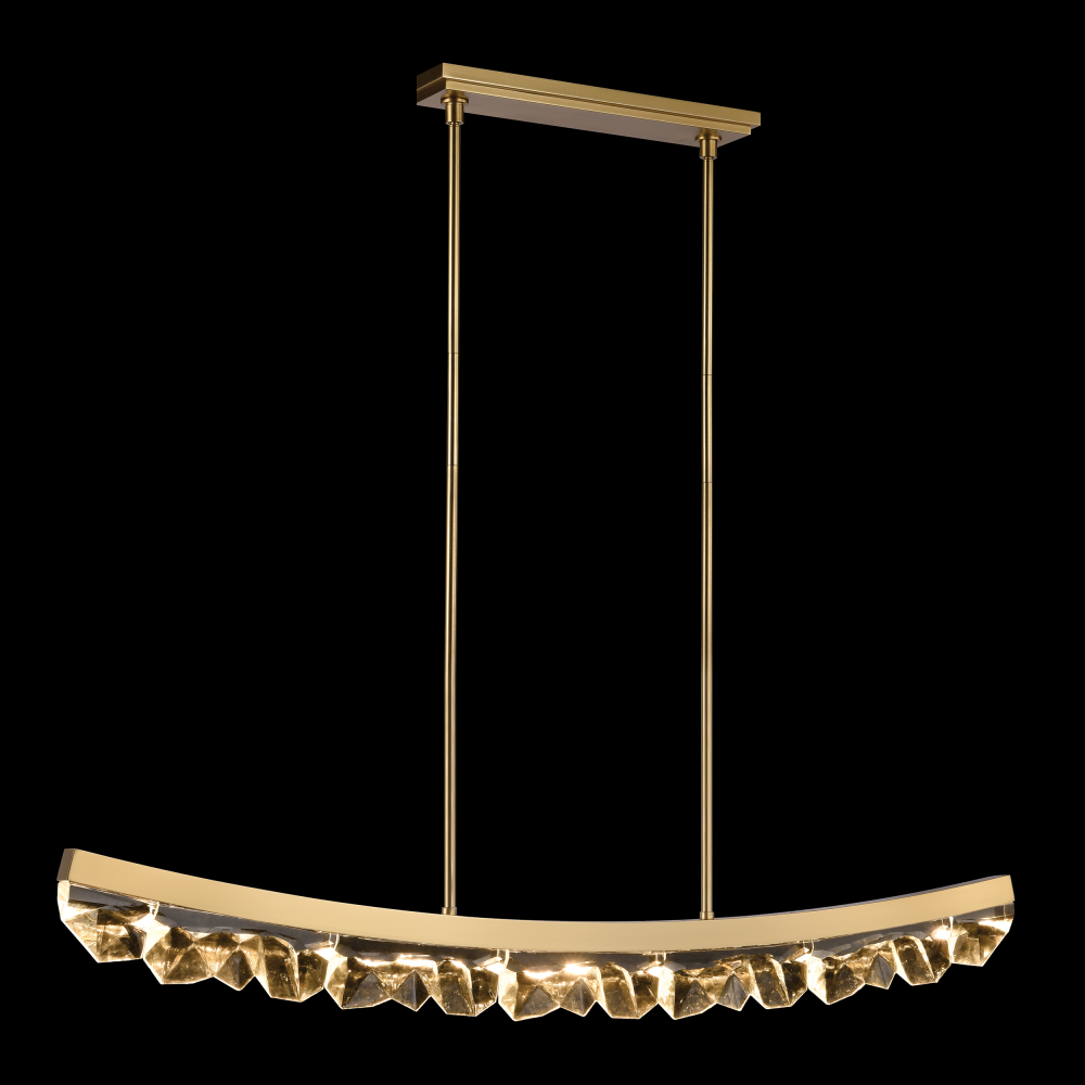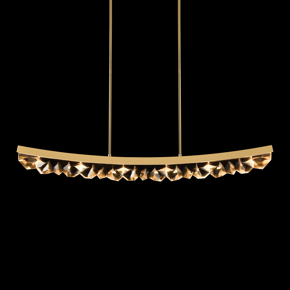 LED 57" Linear Crystal Pendant with unique sleek curved fire polished crystals from end to end. Heavy gauged refined metal with our premium aged brass finish. Integrated Replaceable LED with 3CCT 3000K, 3500K and 4000K.
