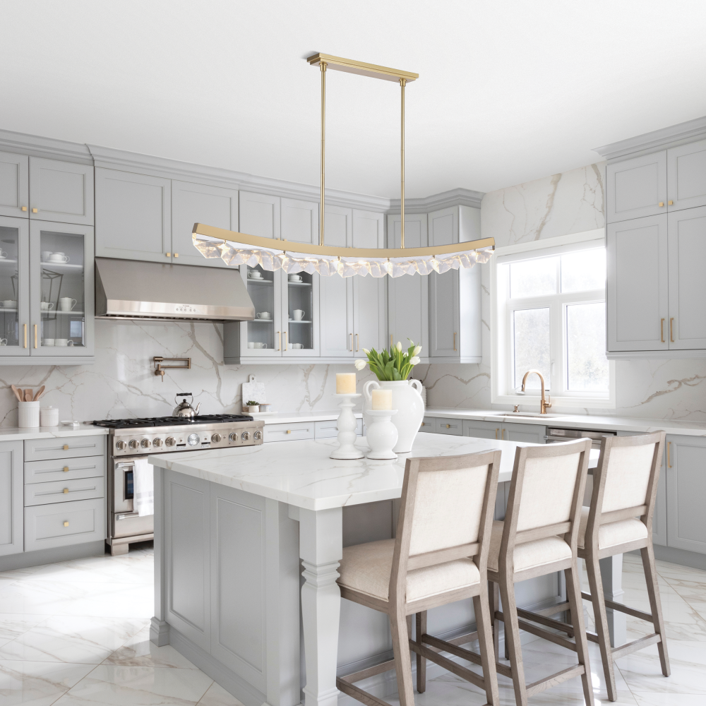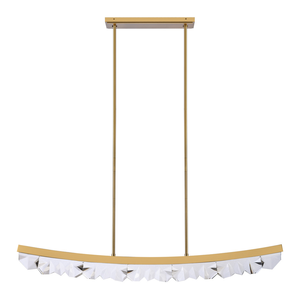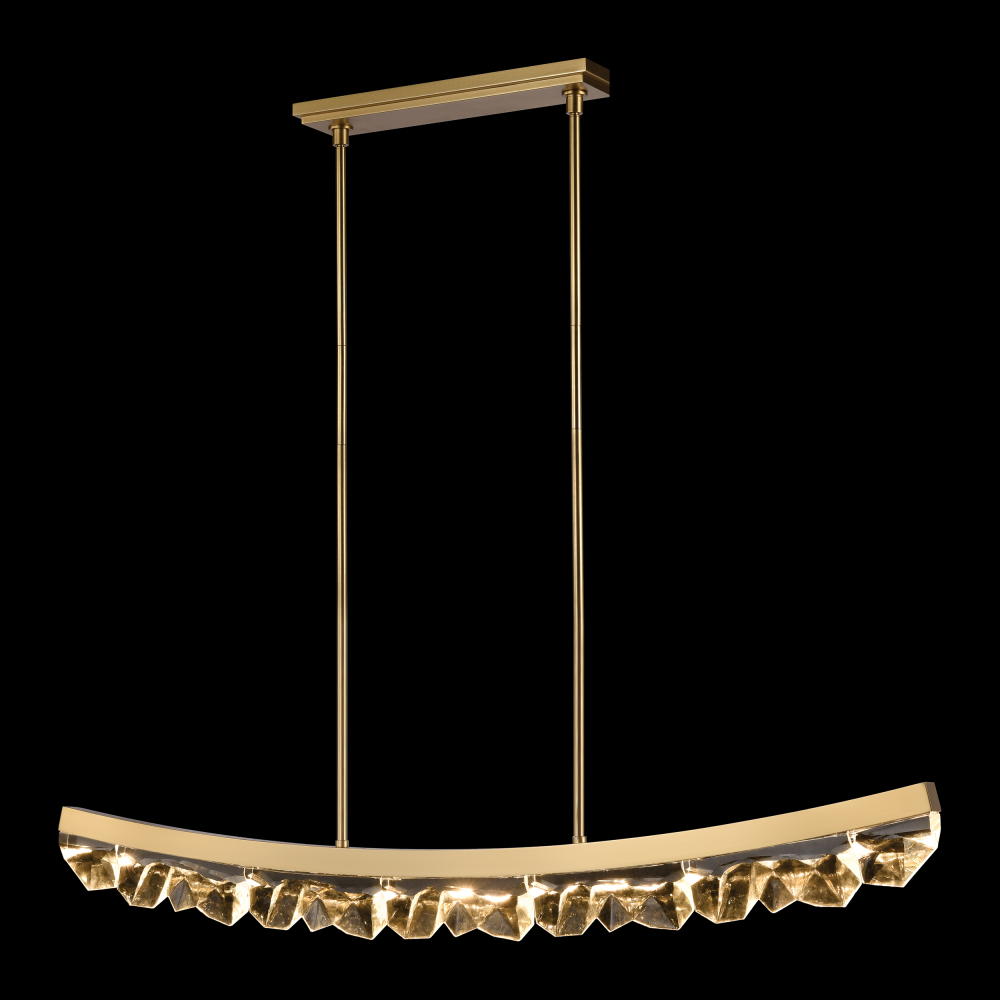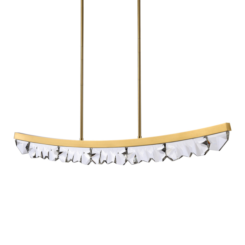 LED 57" Linear Crystal Pendant with unique sleek curved fire polished crystals from end to end. Heavy gauged refined metal with our premium aged brass finish. Integrated Replaceable LED with 3CCT 3000K, 3500K and 4000K.