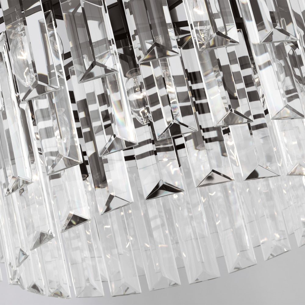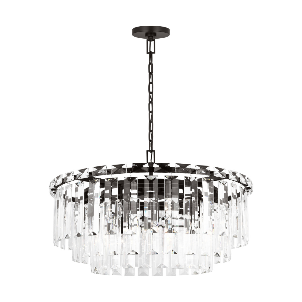 Inspired by the Art Deco style of 1920s Paris, the Arden series by Chapman and Myers captures the period's fascination with geometric forms. A stunning addition to an entryway, great room, or above a large dining table, the Arden tiered chandelier features panels of textured glass that hang in linear architectural tiers from a solid metal frame.