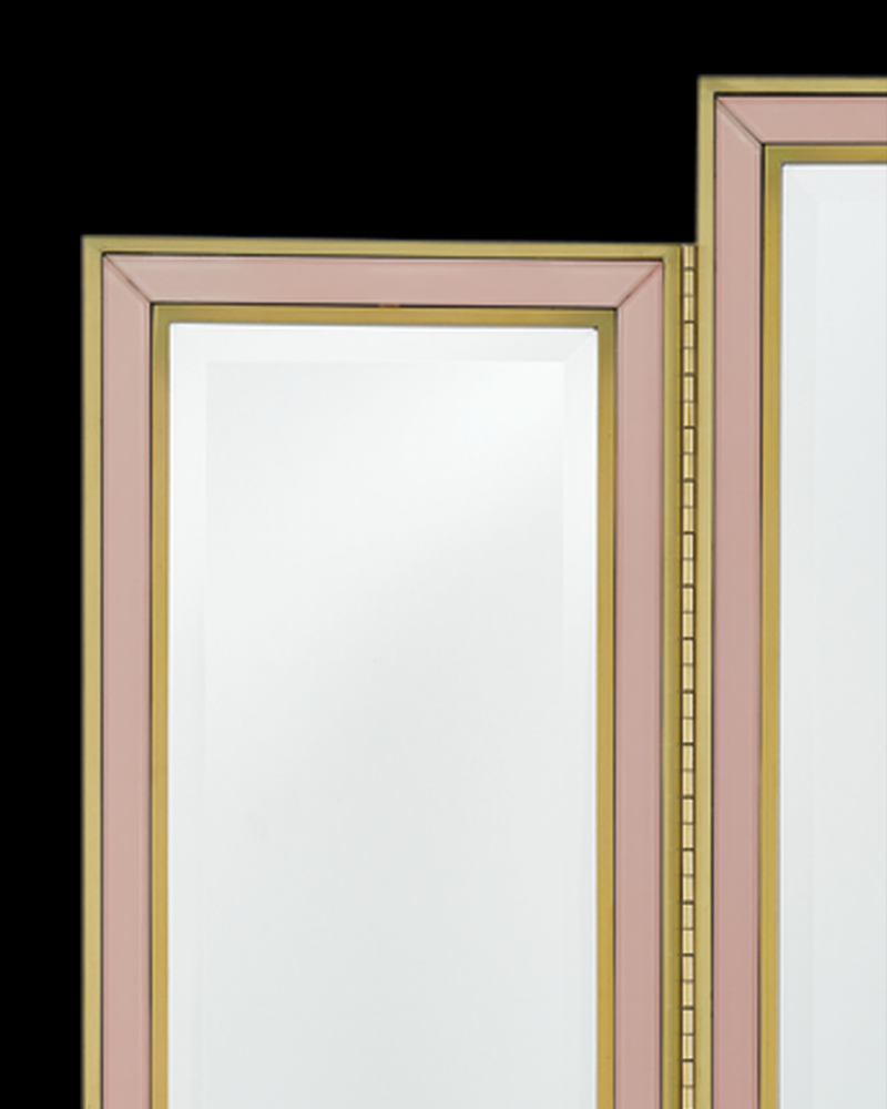Built to sit commandingly atop the Arden Vanity in the same Peony and satin brass finishes, the Arden Vanity Mirror is a model companion to this sophisticated design that brings a hint of Hollywood glamour to an interior. Made of reverse-painted glass and wood, it has beveled glass for an extra dash of panache. It comes with a metal cleat for hanging and a safety bracket for mounting it to the vanity. The Arden family of furnishings includes a number of beautiful pieces.
