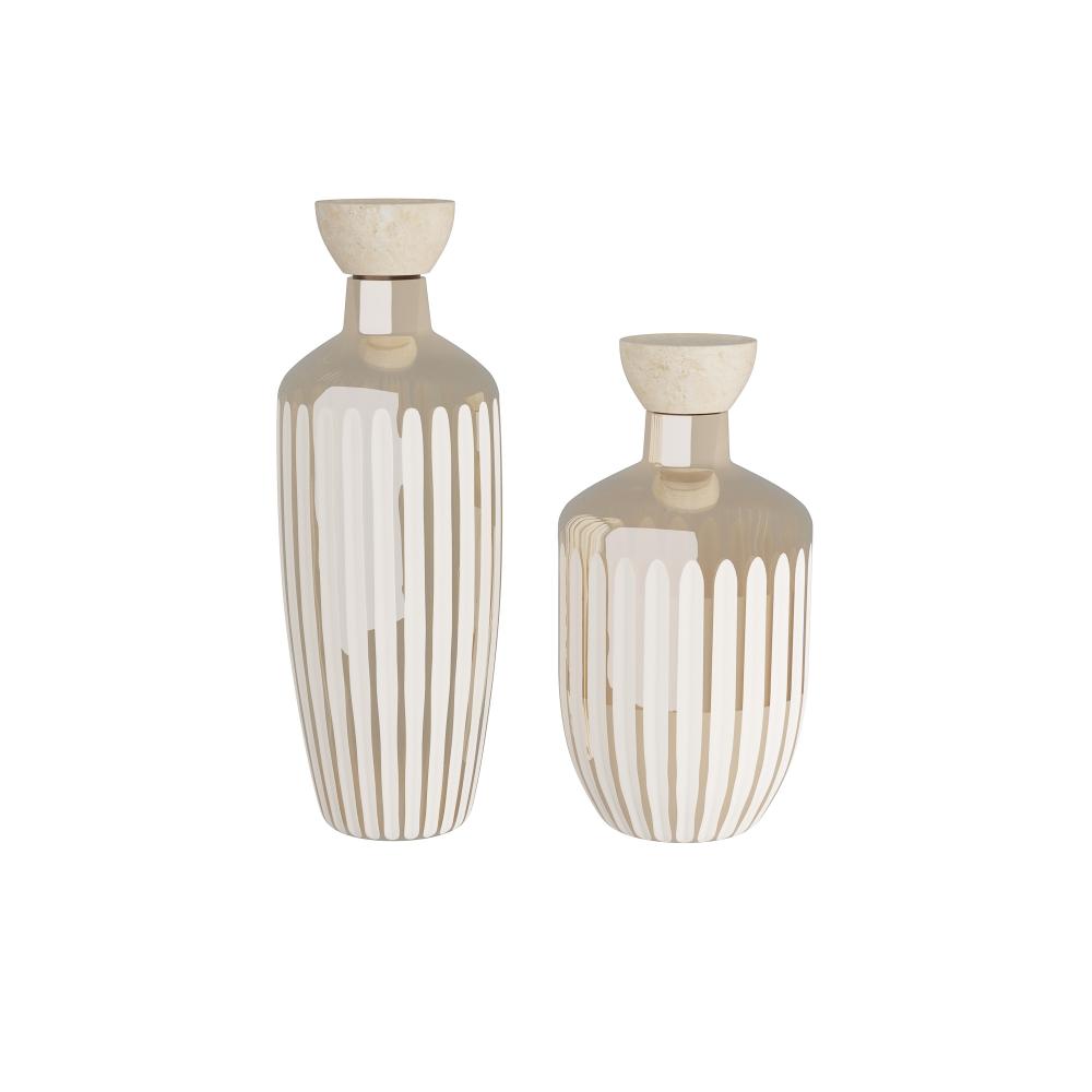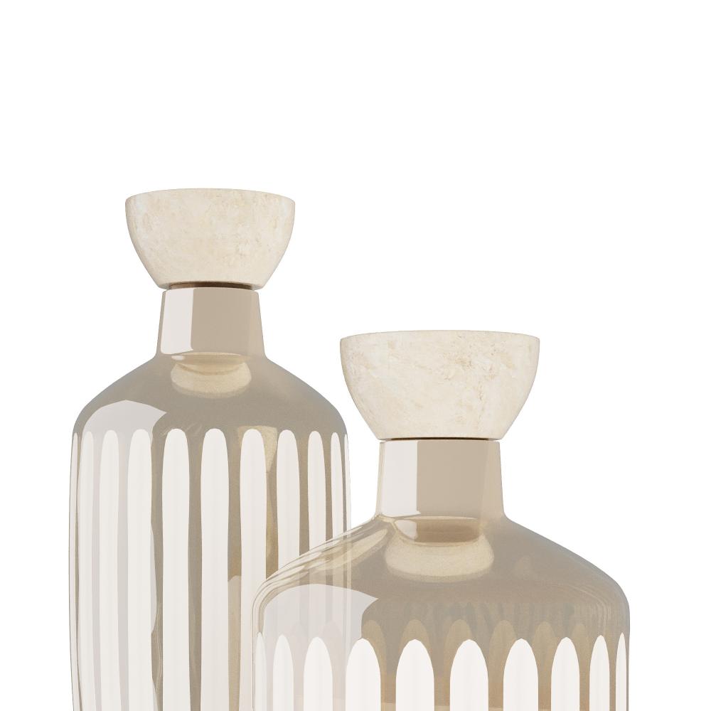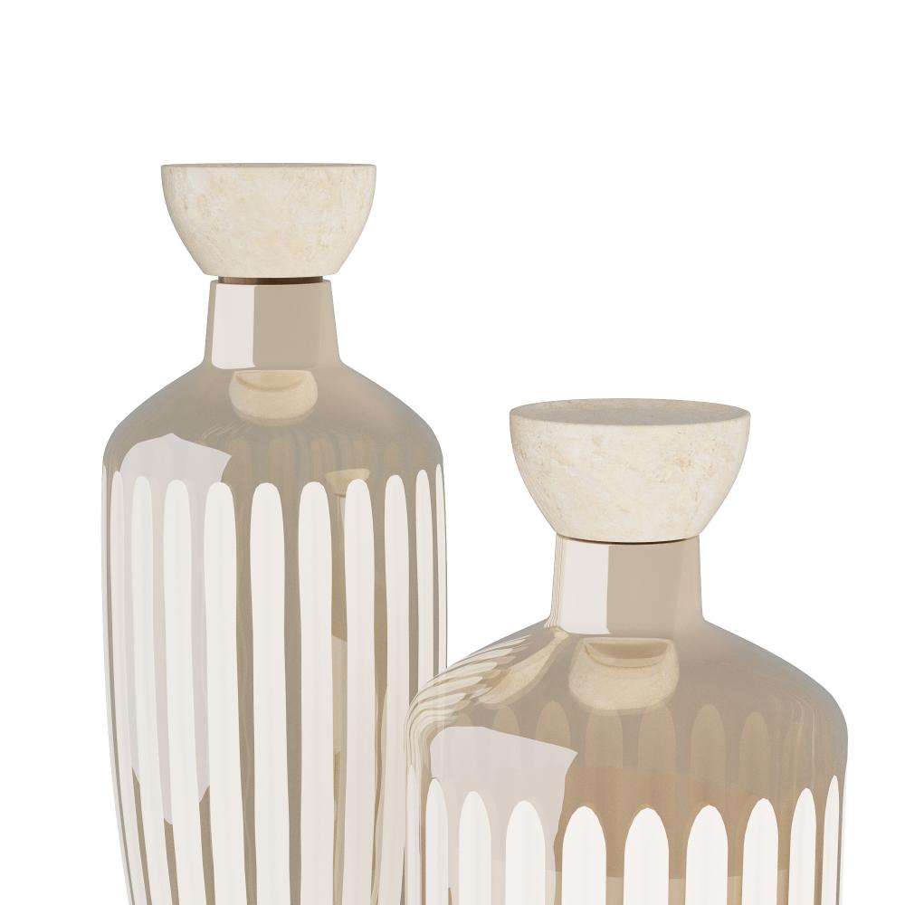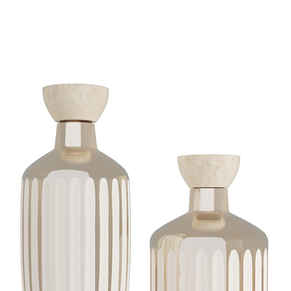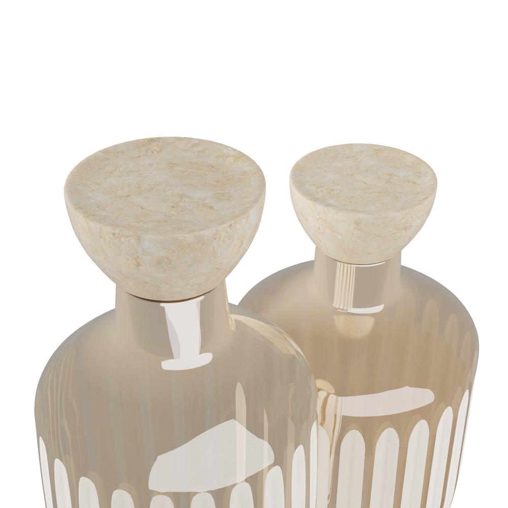 Inspired by vintage perfume decanters. Ribbed vessels of smoke luster-cut glass are topped with sculptural stoppers of grey marble and accented with nickel finished brass details. Set of two. Finish will vary.