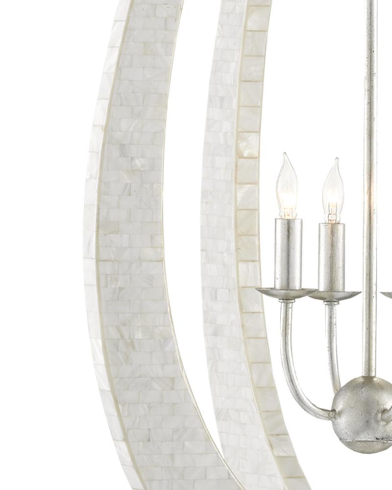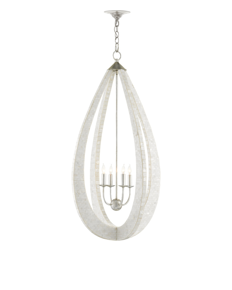 With thin arcing blades covered in hand-applied mother-of-pearl mosaic, our Arietta Teardrop Chandelier is an example of how talented our finish artisans are when it comes to handcrafted surfaces. The metal in a silver leaf finish enhances the glow of the fixture when the four lights of the silver chandelier illuminate. Part of the Arietta family of fixtures, which also includes a rectangular version, this design features a teardrop shape that offers a softer, more delicate tone. The absence of corners gives the chandelier a subtle and more delicate presence. Adjustable from 46.5" to 112.5" with use of included chain/rod kit/cable. If your space calls for a longer drop, additional chain/rods/cable is available for purchase.