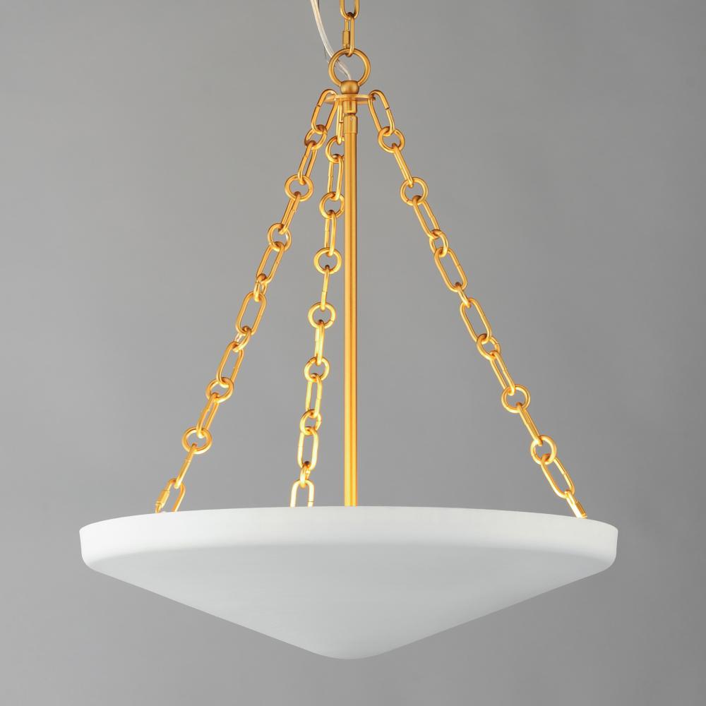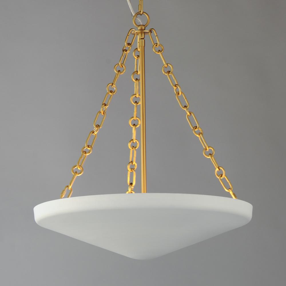 An inverted steel cone vessel painted in textured Plaster White gesso provides ambient lighting with classical styling. The stylized ring and oval chain links in Natural Aged Brass compliment the overall design. Available in two sizes of pendants and flush