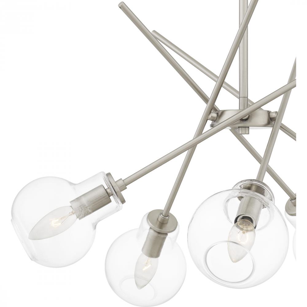 Bold lines and glass orbs create a modern, futuristic look in Asha. The sputnik-inspired chandelier comes in brushed nickel and features open, clear glass globes for a playful lighting effect. With a fun and geometric design, Asha makes an eye-catching sta
