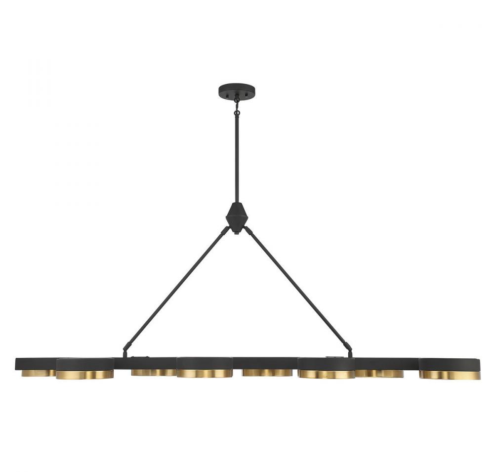 Substantial in size and style, the Savoy House Ashor 8-light linear chandelier is designed to beautify large spaces with its geometric look and two-tone finish. Sparkling faceted crushed crystal inside each light, illuminated by integrated LED, will truly wow anyone who sees it. Ashor is 60" in length, 18" in width and has an adjustable height ranging from 29" to 75". Comes with four 12" downrods and one 6" downrod, plus 80" of cord.