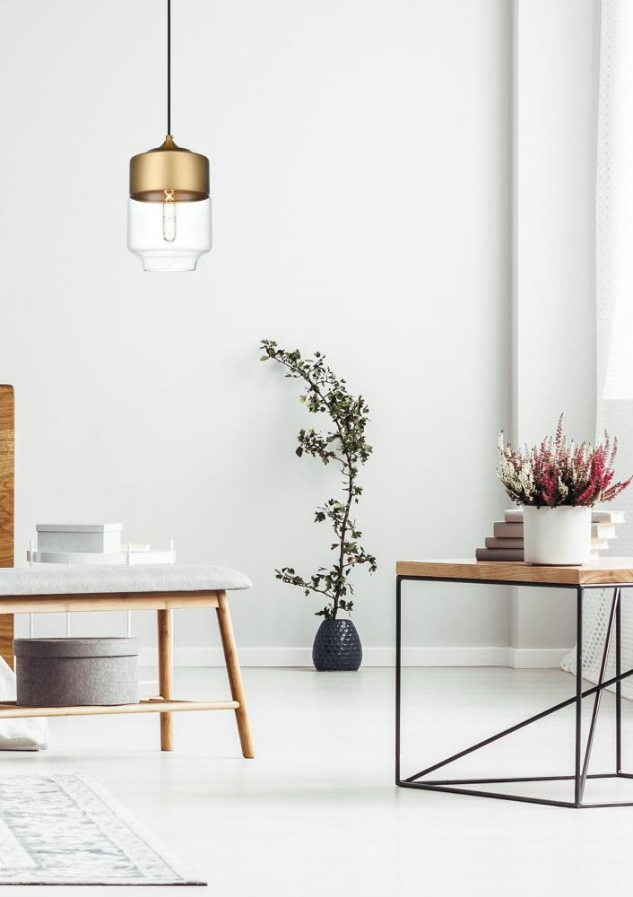 Features a clear glass shade, offering bright, unobstructed light and a clean, modern look.