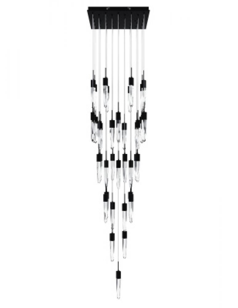 Forty-one signature cascading hand-carved clear crystals suspend from our Aspen Collection's sleek canopy to artfully evoke rainfall. These crystalline staves project gorgeous LED illumination from all sides for a dazzling presentation of light.