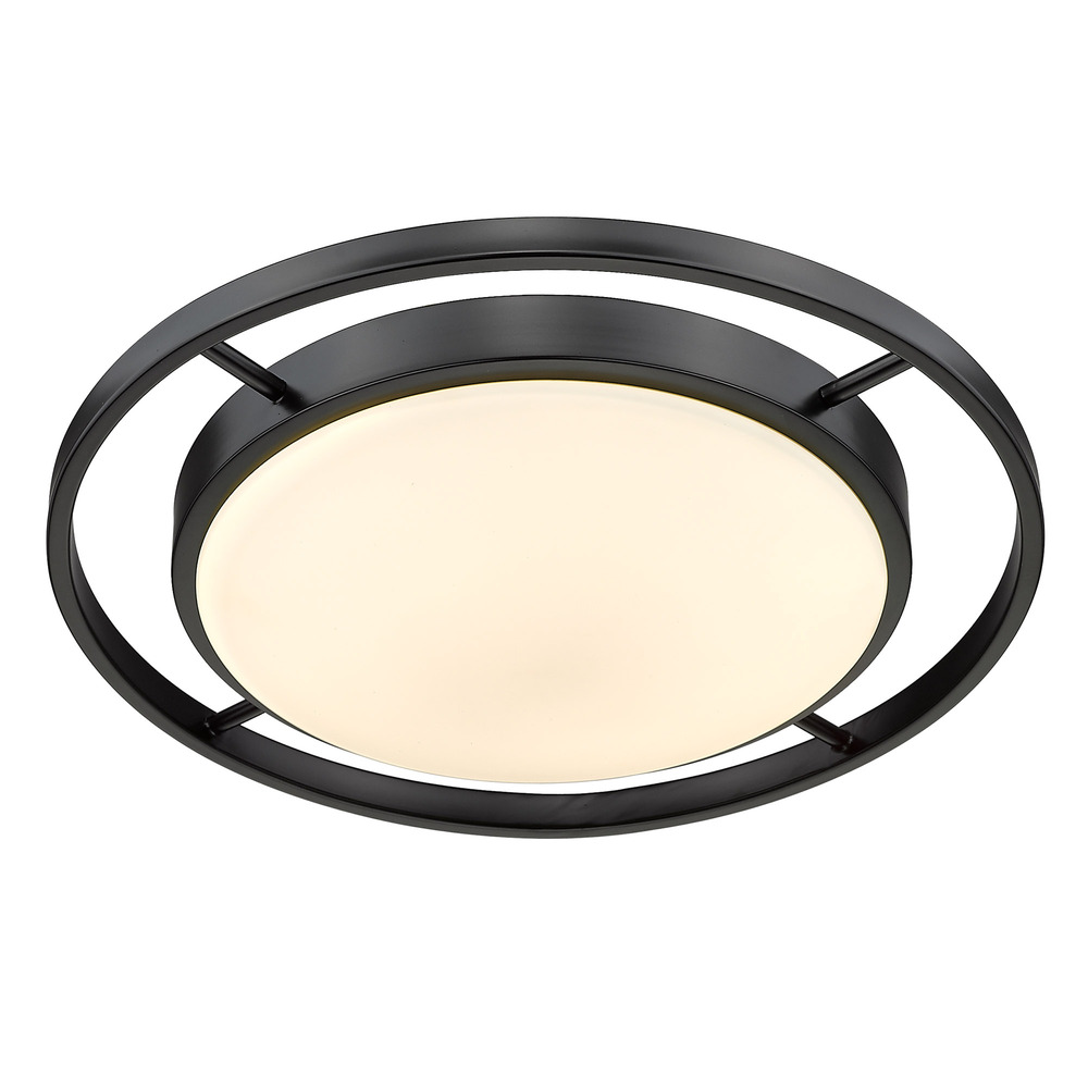 With LED lamping and a clean silhouette, Astra offers a blend of Modern and Transitional styles. The matte black finish contrasts the bright, white opal glass. When lit, the unique halo pattern adds a geometric aspect to the look. The fixtures are available in multiple sizes. This flush mount provides wide-spread ambient lighting and is perfect for contemporary homes.