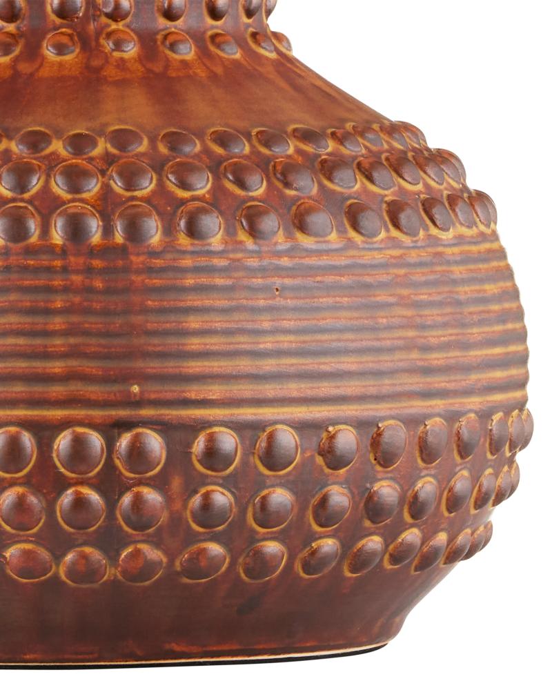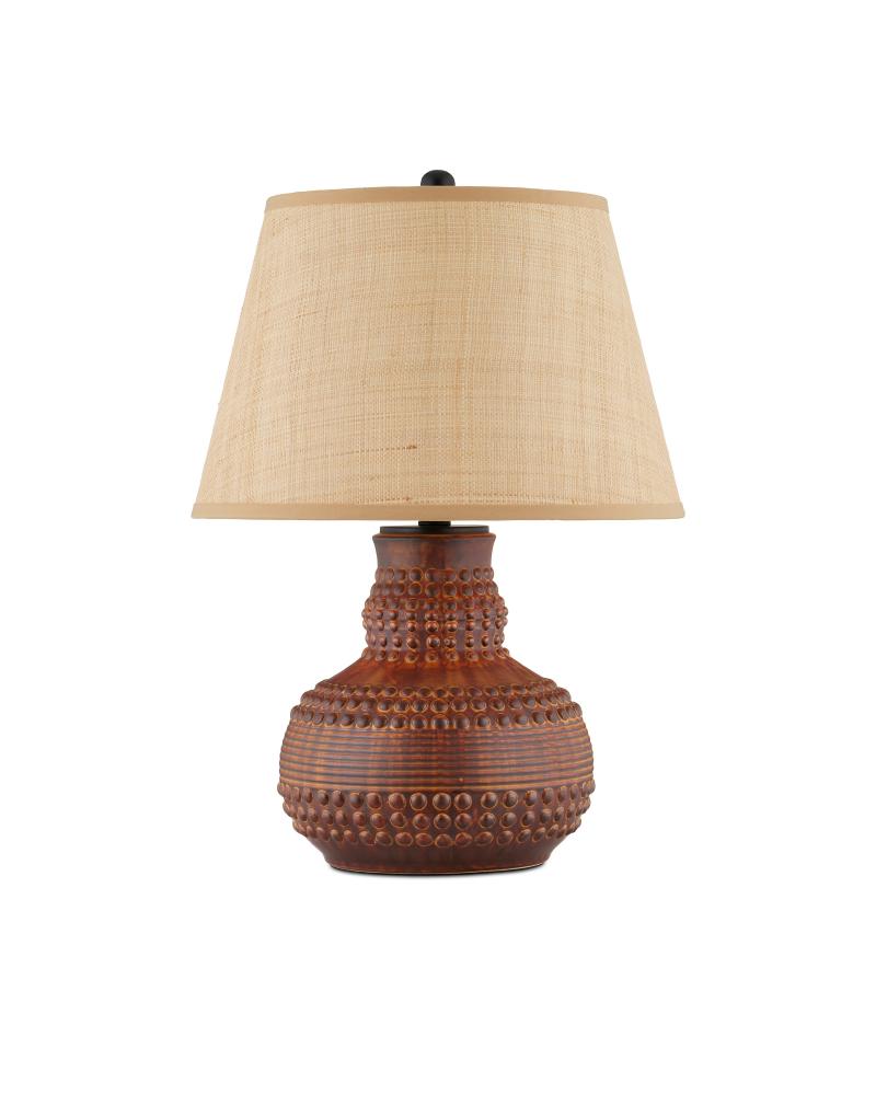 Inspired by a medicine man's rattle, the Atamo Table Lamp is made of ceramic with a rust-leaning dark brown glazing that creates added texture on the surface of the brown lamp. The finish on the hardware and finial is called rustic black, and it draws out the dark tones in the lamp's body. The grasscloth shade not only echoes the lighter tones in the glazing, it adds texture to the overall composition.