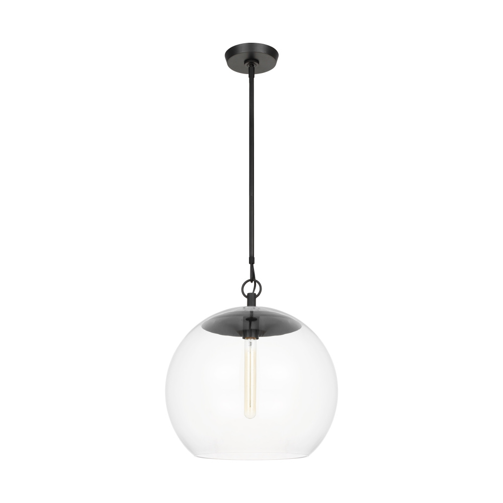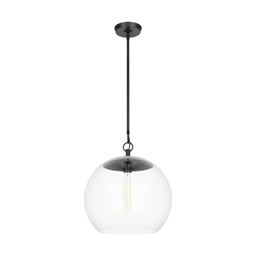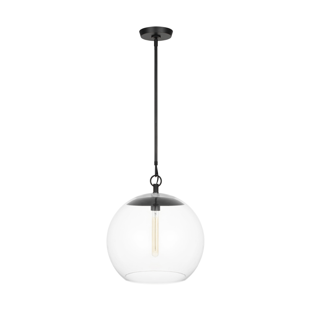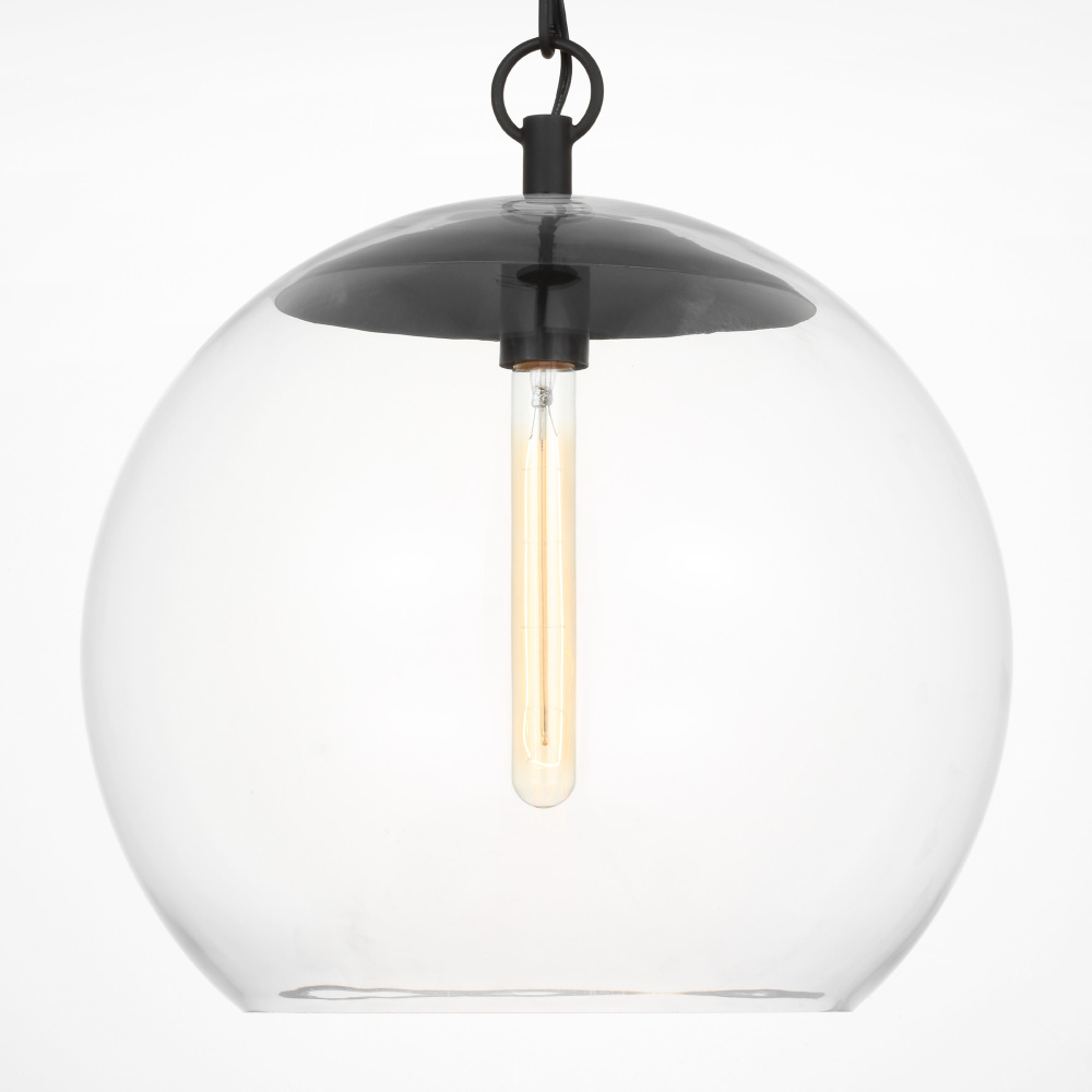 Designed by Chapman & Myers, the Atlantic series features globe and conical Clear Glass pendants paired with hardware in rich finishes; these work well singularly or in multiples to elevate any room. The lamping suspends from the center and appears floating within the Clear Glass shade.