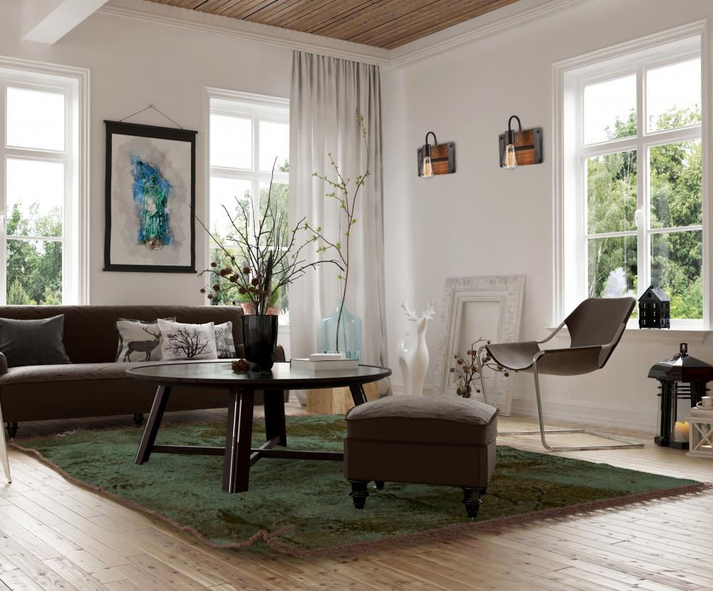Farmhouse design accented with bolted metal and distressed wooden slats.