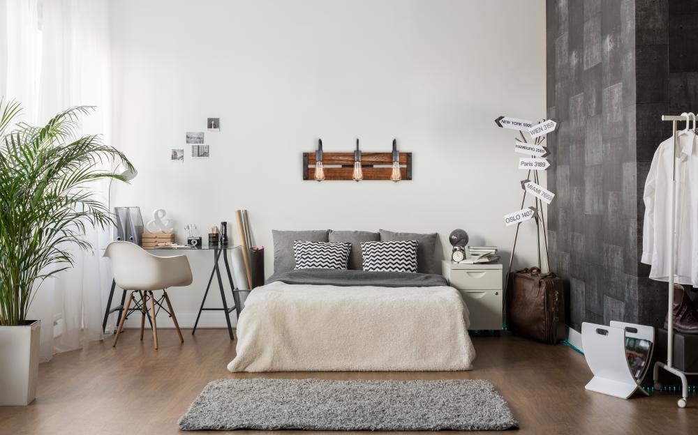 Farmhouse design accented with bolted metal and distressed wooden slats.