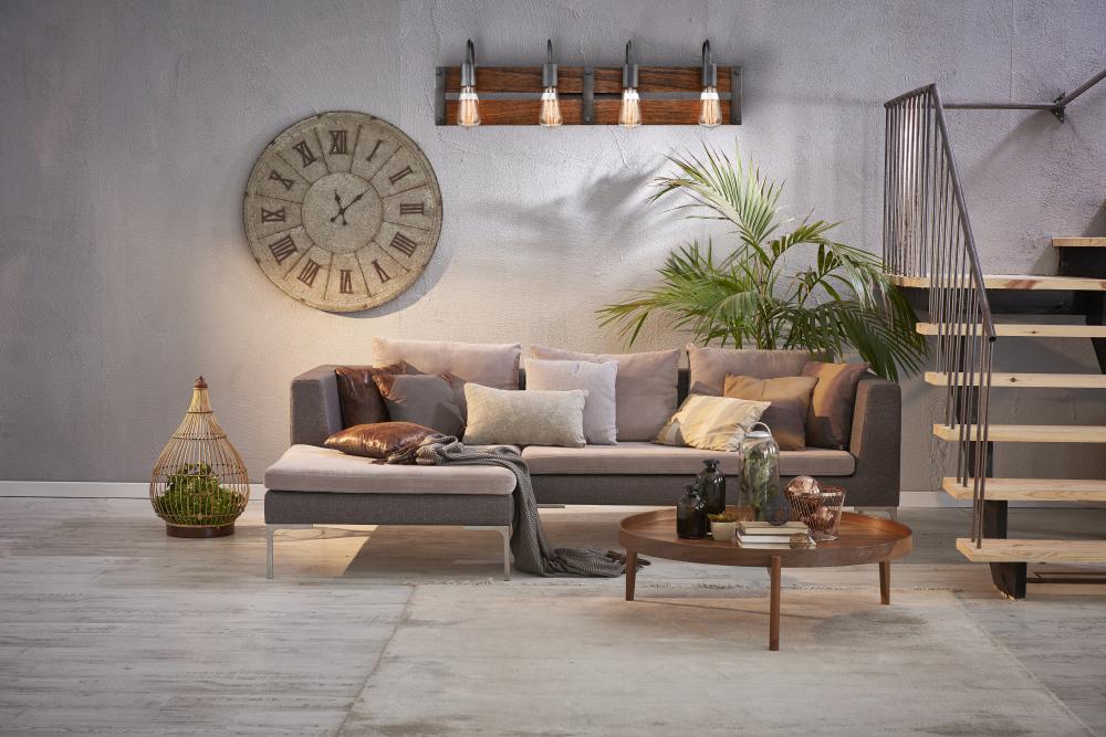 Farmhouse design accented with bolted metal and distressed wooden slats.