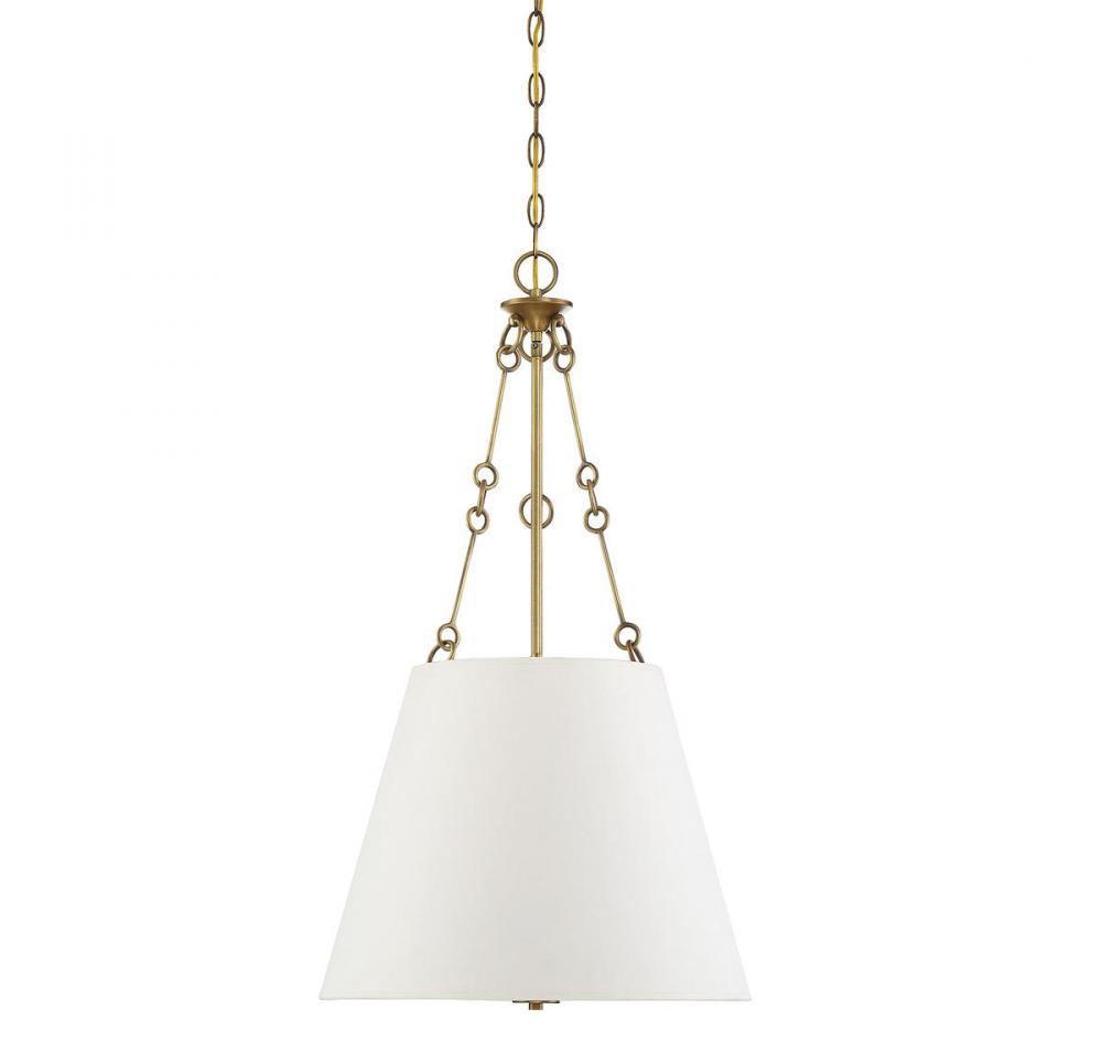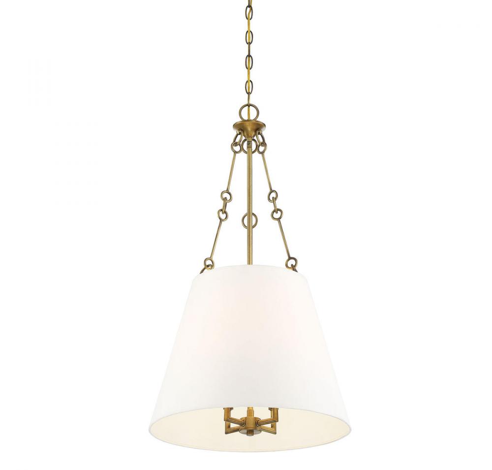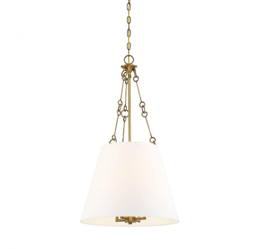 This Savoy House Austin 4-light pendant has a crisp and transitional style with a large white fabric shade that obscures the light sources, creating a soft and comfortable glow. Warm brass finish. Pendants are extremely versatile and can fit in many different spaces, such as kitchens, family rooms, great rooms, foyers, entryways, offices, bedrooms and bathrooms. Because this pendant is chain-hung, you can use as much or as little chain as you need to fit your specific hanging height needs, and this pendant can be used on a sloped ceiling. Bulb not included. You can pair Austin with hardware finished in brass or mix it with hardware in other finishes. Its subtle elegance means it is a perfect choice for rooms of any decor style. When you choose a Savoy House lighting fixture, you can be certain you've selected a piece that will withstand the test of time.