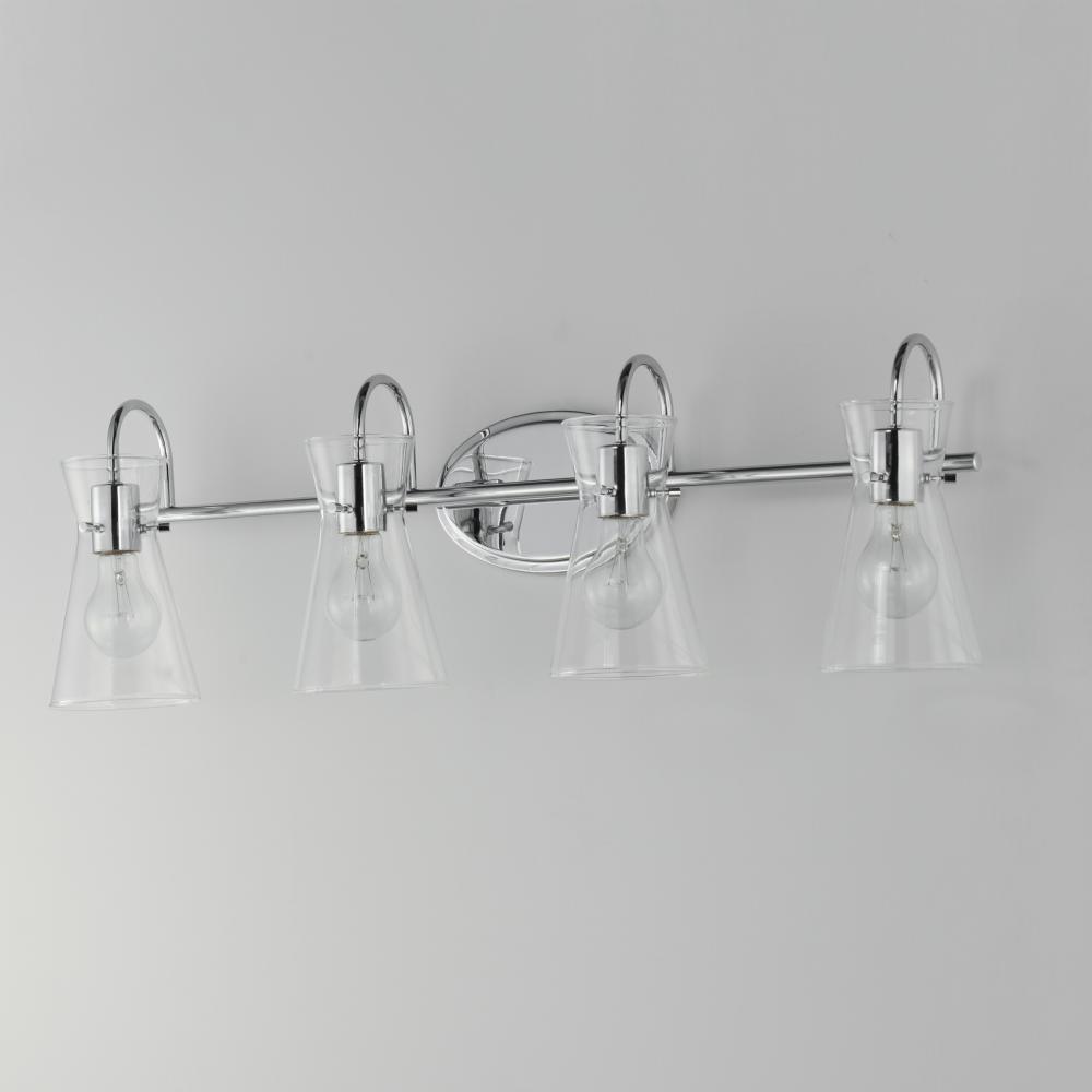 Suspended by three pin connections, the sharp silhouette of Ava's angular glass provides a designer look to enhance your bathroom design. Using Clear glass and a variety of complementary metal finishes the sconces are available in Black, Polished Chrom