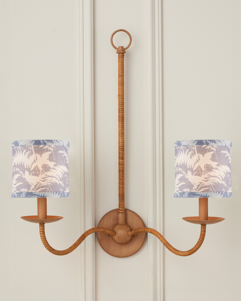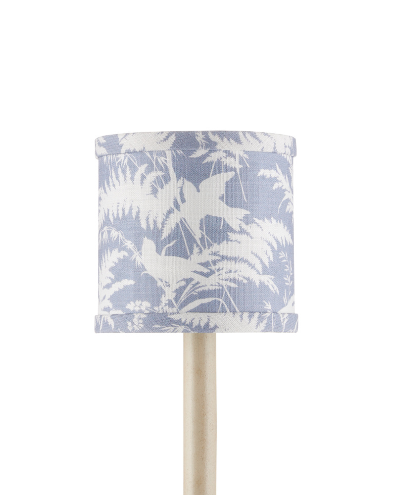 A reverse-printed image of birds amidst fern fronds stands out against a dusty blue background on this drum-shaped chandelier shade from our partnership with Lacefield Designs.