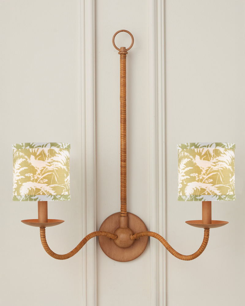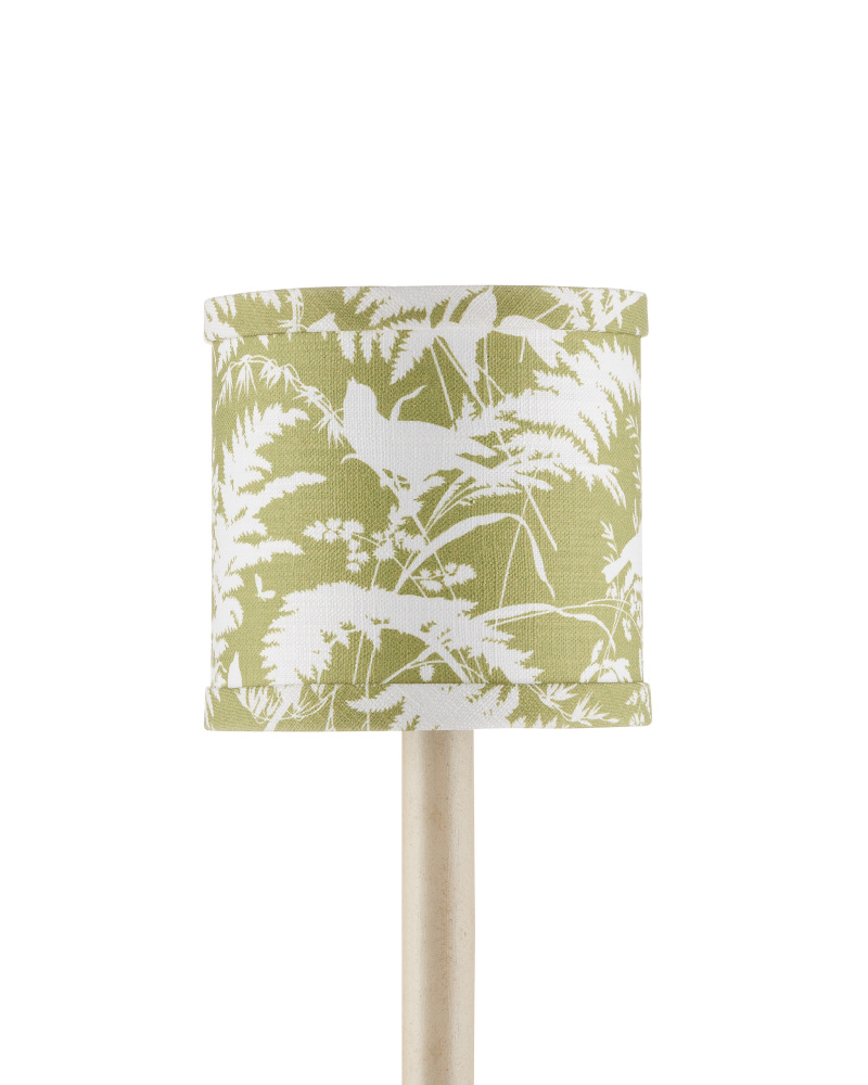 A reverse-printed image of birds amidst fern fronds stands out against a citron green background on this drum-shaped chandelier shade from our partnership with Lacefield Designs.