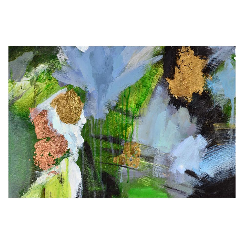 Layers of paint convey the frenetic energy of street art in this modern painting with urban influences. The hand-painted canvas erupts in an explosion of color as shades of green collide with blue, black and white brushstrokes, as metallic gold and copper accents make the Matte canvas sparkle. The modern painting’s black frame adds a formal finish to the abstract composition, creating an extraordinary exhibition on interior walls in every room.