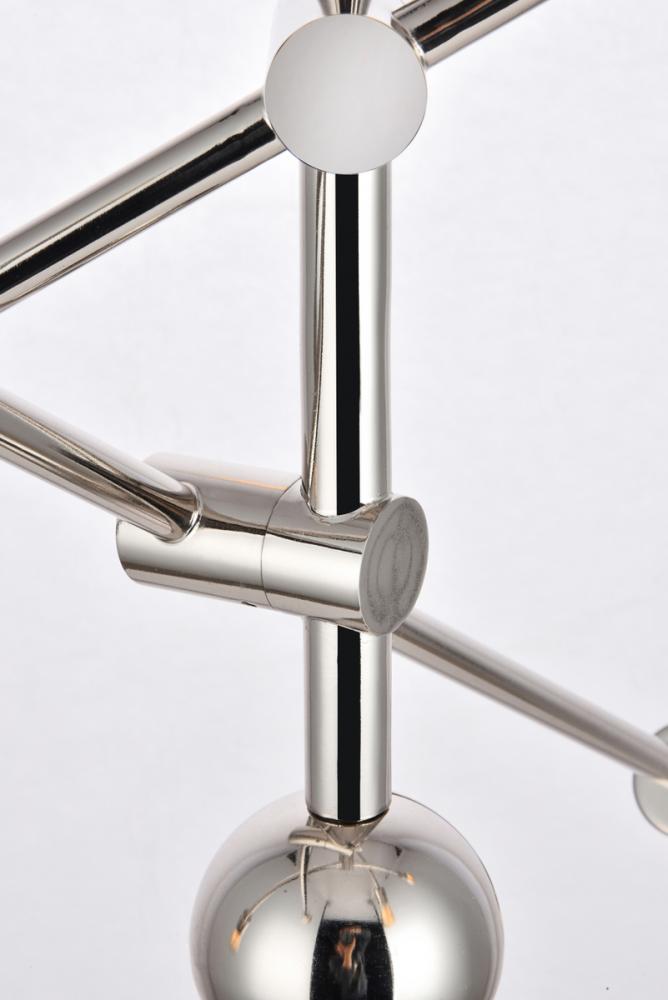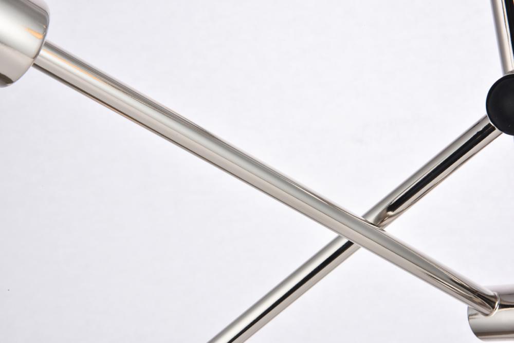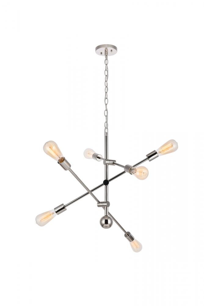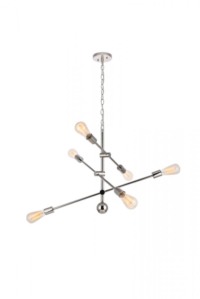 Modern sophistication with a jaunty presentation. This Axel pendant features three adjustable crossing arms mounted on a central rod to direct light in any direction. A total of six light sources (bulbs not included) promises stunning utility in all your living spaces. The absence of shades says industrial; the design says penthouse. The smooth steel hardware is finished in reflective polished nickel, adding to the art deco flair. Stylish and cutting-edge without being too eccentric.