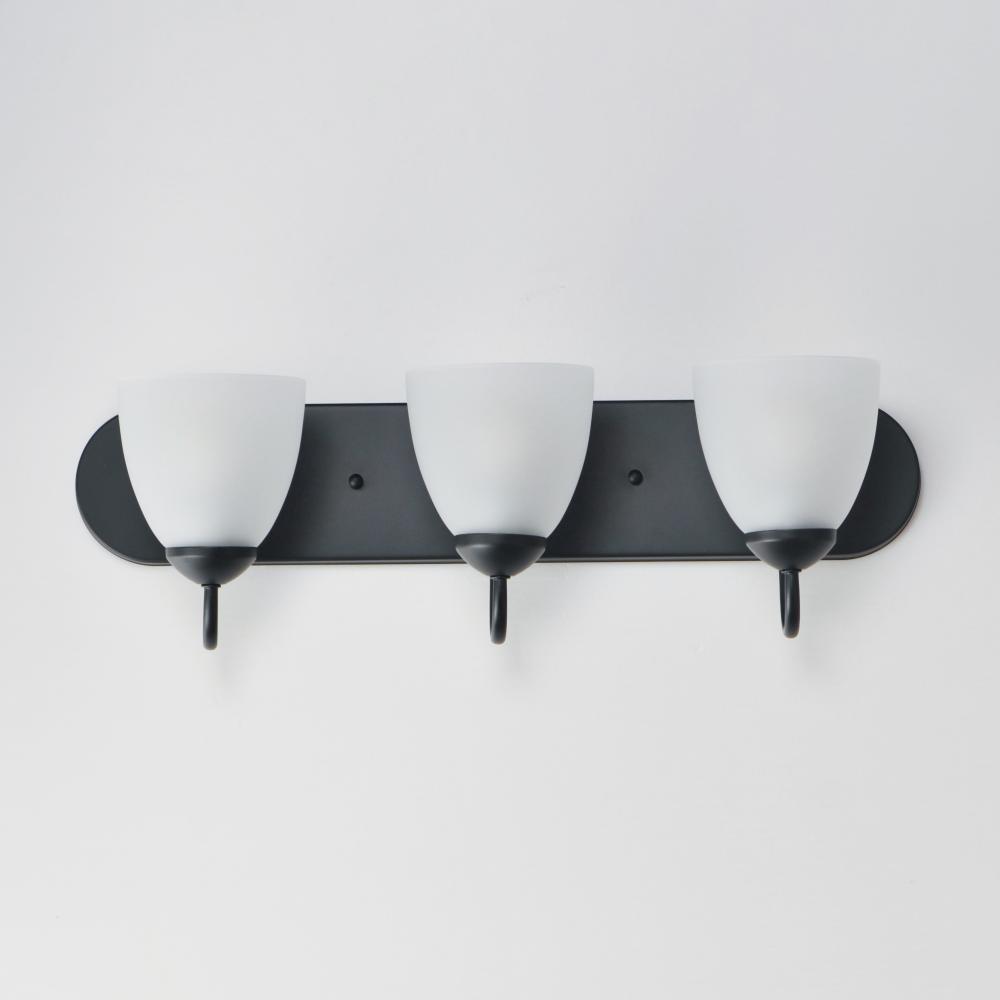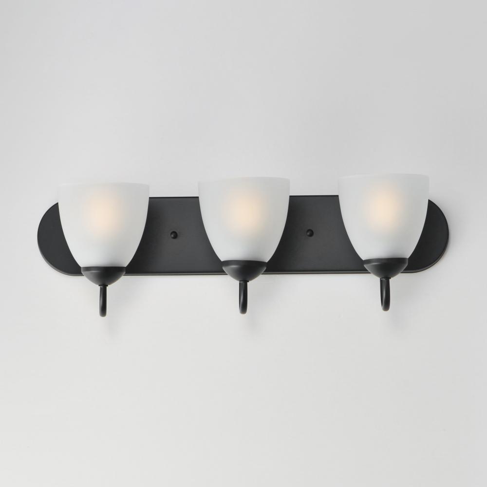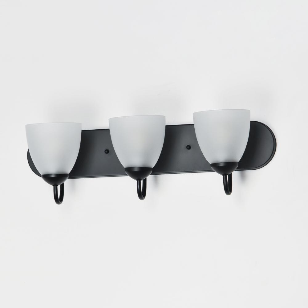 This transitional design works in any style home. Full length oval backplates support simple bell-shaped, Frosted glass shades. Available in Satin Nickel, Matte Black, and Polished Chrome.