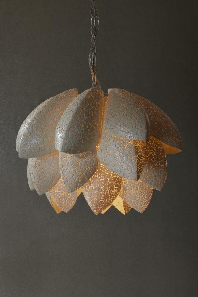 Inspired by the crackled finishes of early 20th century fine French antiques, this petaled fixture is a textural delight. Each shade is applied with ivory resin composite made from genuine eggshells, so that no two are ever quite alike. The iron chain and canopy are finished in white to blend in with the overall aesthetic. Finish will vary.