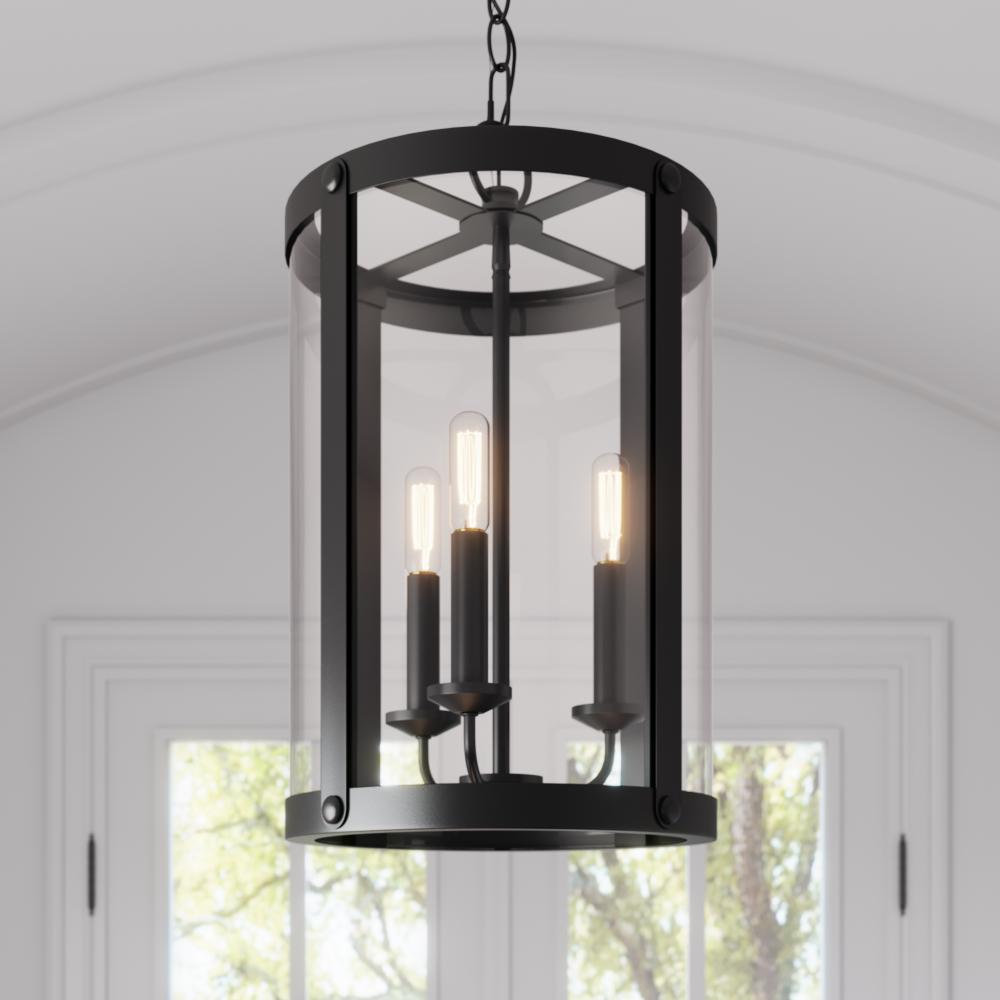 Sparkling clear glass cylinders set into a minimalist steel constructed framework provide abundant light in the Aydenn Collection of pendant lighting. Finished in quintessential matte black or gleaming brushed nickel, these definitive design statements are a bright addition to the foyer or hall.