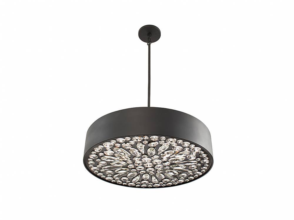 The Savoy House Azores 6-light pendant has a fashionable yet unassuming look until you observe it from below. When viewed from that angle, you can see an array of beautiful faceted crystal gems in a flower-like shape. Whether the lights are on or off, Azores is sure to shine. Finished in matte black. Azores is 6" in height and 28" in width. It uses 6 candelabra size bulbs of up to 60 watts each (bulbs not included). Comes with four 12" downrods and one 6" downrod.