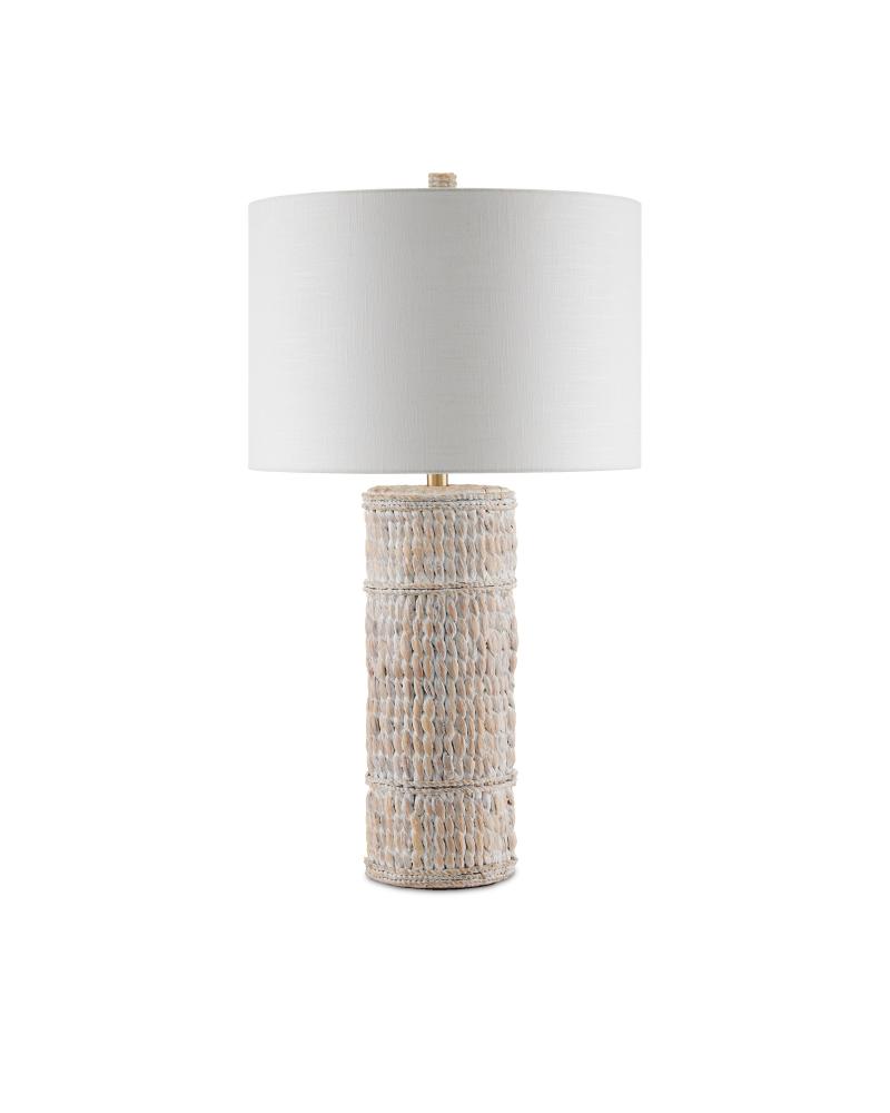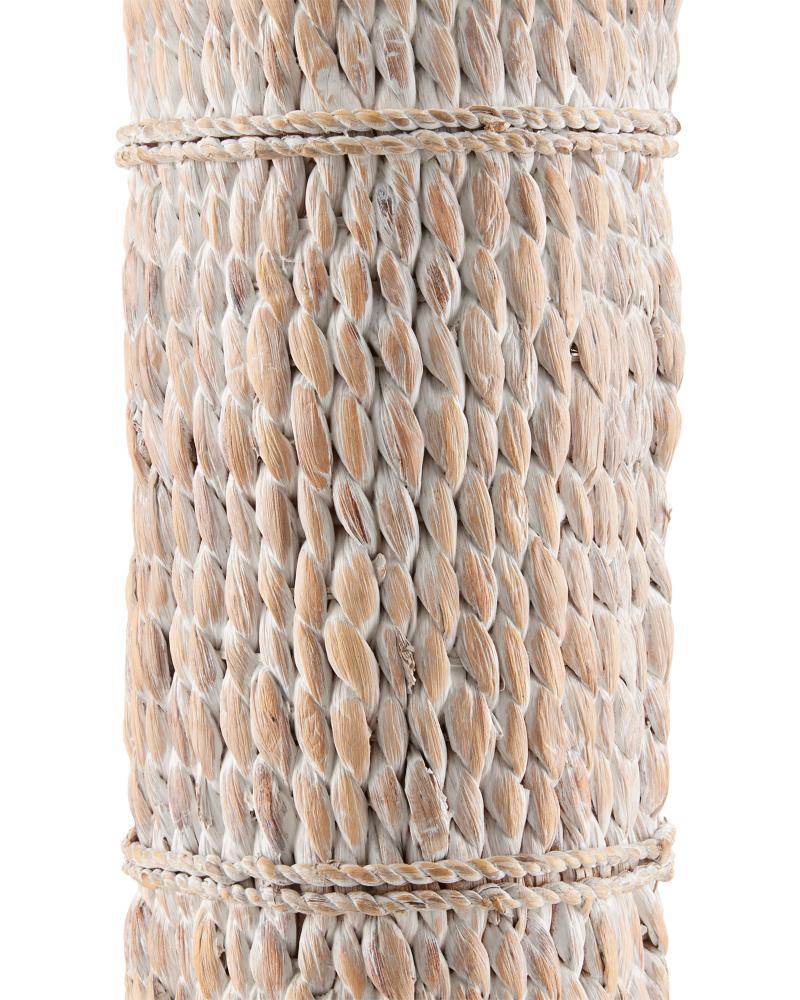 The Azores White Table Lamp has a body covered in woven water hyacinth that has a light white wash over the natural material. This is one of our sustainably inspired offerings because the plant grows naturally in Vietnam in the streams, and people harvest it to make baskets. Because it grows wild and voraciously, removing the plants keeps the streams from clogging. Design details of note are how the water hyacinth is woven in different directions and the matching finial.