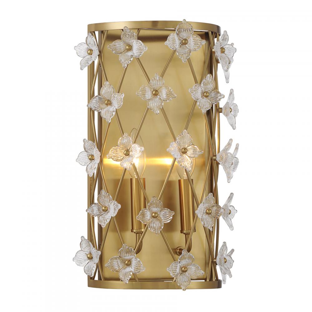 The Savoy House Bailey 2-light sconce offering a fresh take on a familiar form. The open shade is finished in Warm Brass and has a latticework pattern festooned with glass flowers. It mixes edgy with classic in an impeccable way. Bailey is 15.5" in height, 9.75" in width and extends 5.5" from the wall. It uses two candelabra size bulbs of up to 60 watts per bulb. Bulbs not included. This sconce is damp area rated.