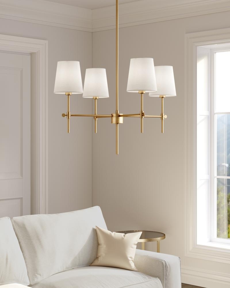 The Baker four light single tier chandelier in satin brass supplies ample lighting for your daily needs, while adding a layer of today's style to your home's décor. A lantern-like design with curved arms connecting to a cube-shaped frame
