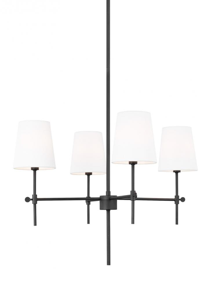 The Baker four light single tier chandelier in midnight black provides abundant light to your home, while adding style and interest. A lantern-like design with curved arms connecting to a cube-shaped frame