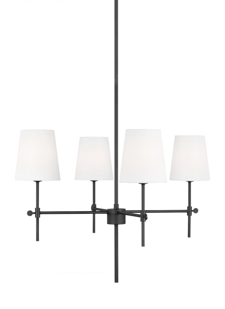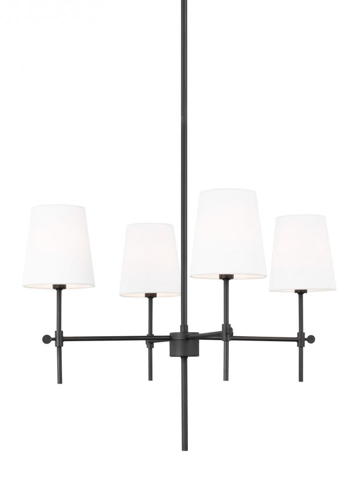 The Baker four light single tier chandelier in Midnight Black introduces transitional-inspired design to your living room or dining room. It's made from metal and features a round body with arms that support sleek torchieres. Round finials and faux candle holders complete the look with a hint of traditional appeal. White linen fabric shades cap the design and diffuse the light from 60W candle bulbs (not included). Available in three finishes
